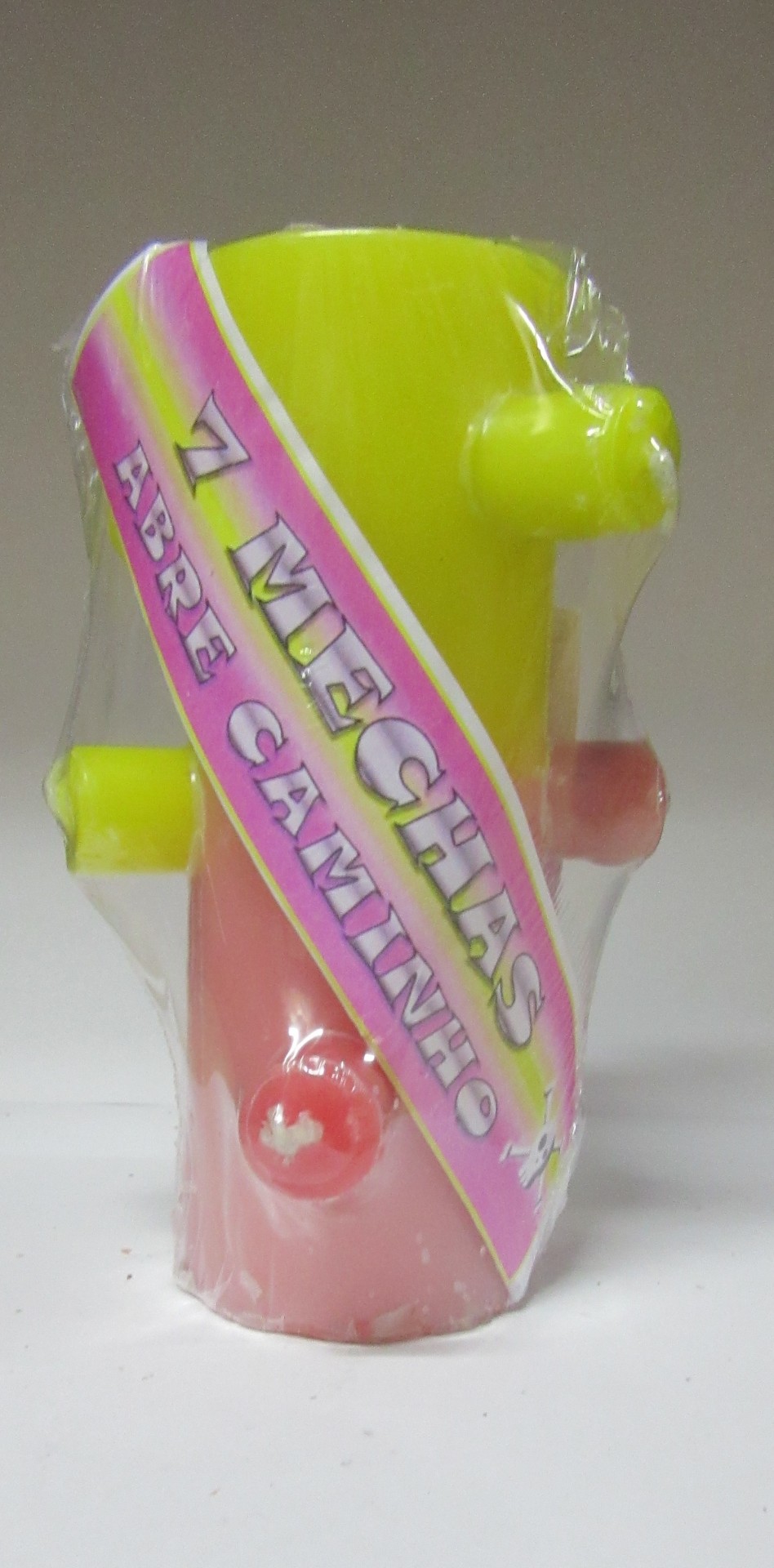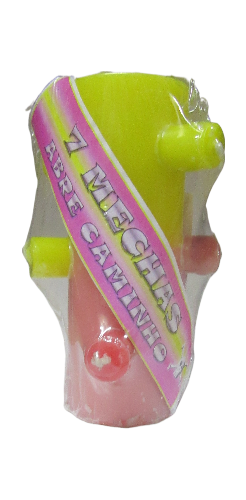 Objeto plástico amarelo e rosa com etiqueta '7 MECHAS ABRE CAMINHO'