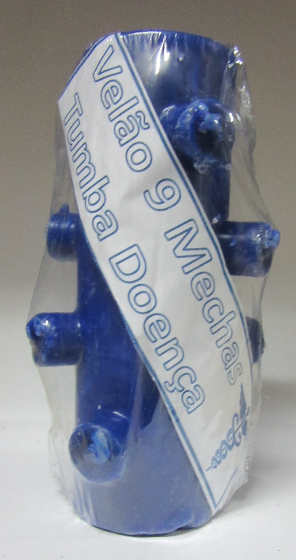 Vela azul com nove mechas e etiqueta em plástico transparente