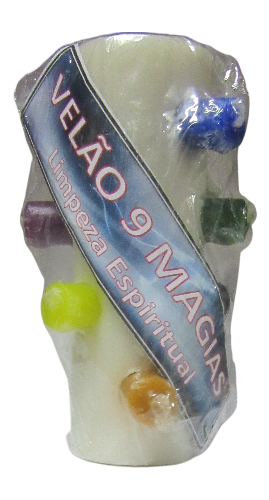 Vela branca decorativa com 9 velas coloridas anexadas e rótulo 'VELÃO 9 MAGIAS Limpeza Espiritual'