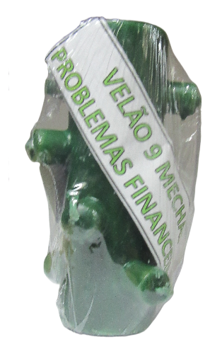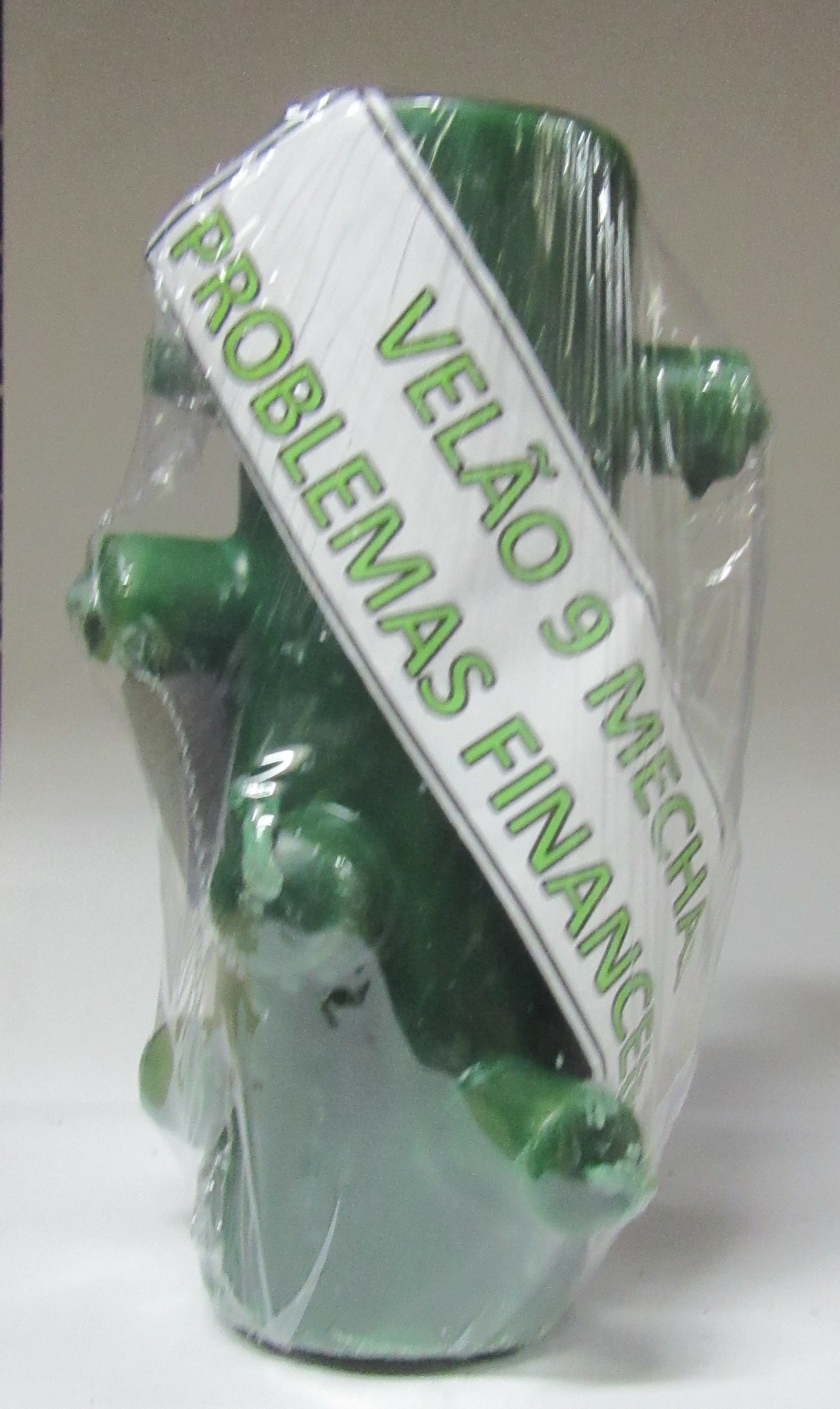Vela verde de nove mechas em saco plástico com etiqueta escrita 'VELÃO 9 MECHAS PROBLEMAS FINANCI'