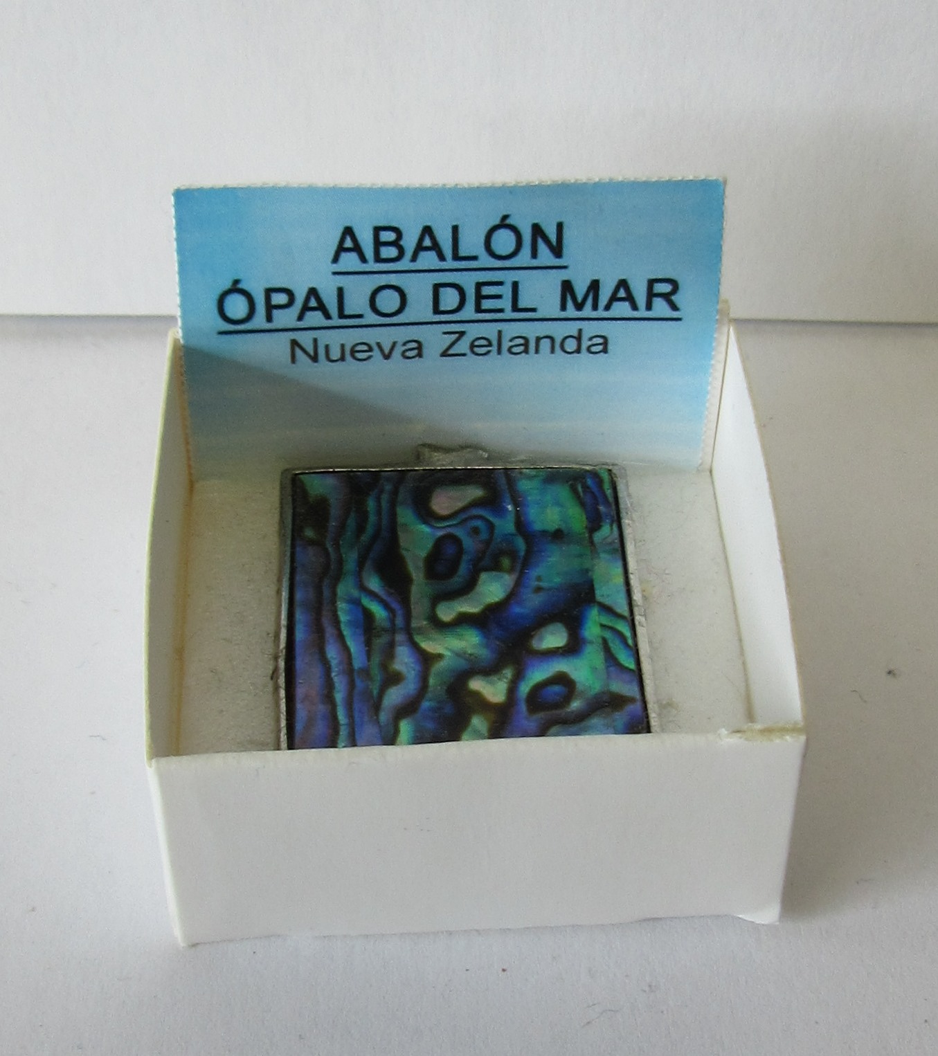 Objeto quadrado com padrão iridescente em caixa branca e cartão azul com texto