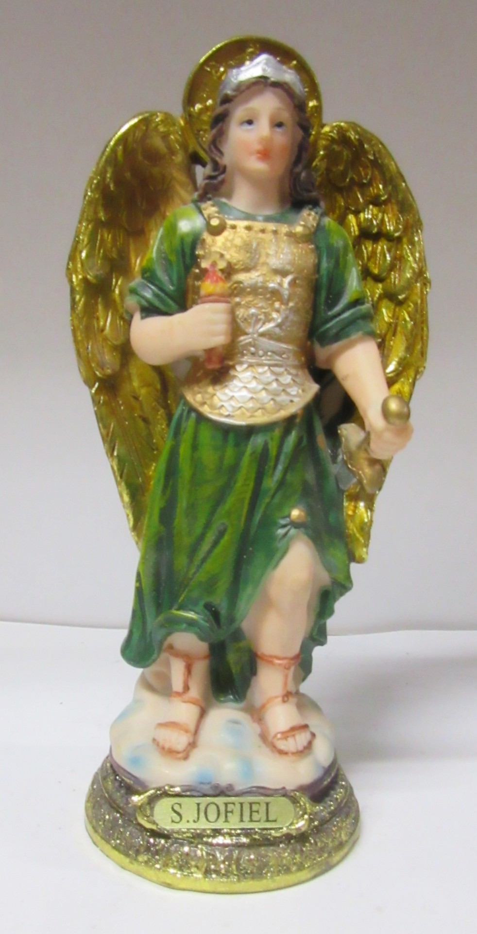 Estátua colorida do Arcanjo S. Jofiel com asas douradas e placa identificadora