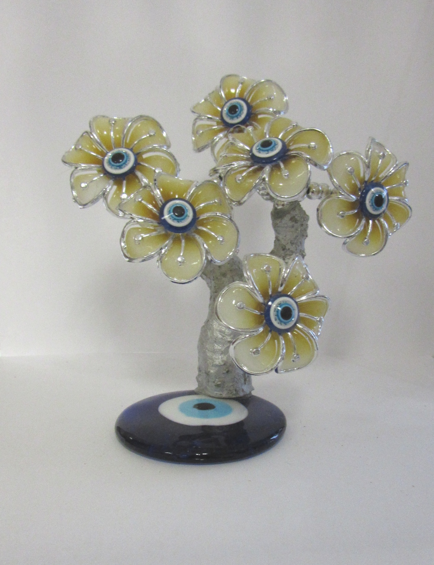 Escultura de flores amarelas com olhos decorativos em base redonda preta.