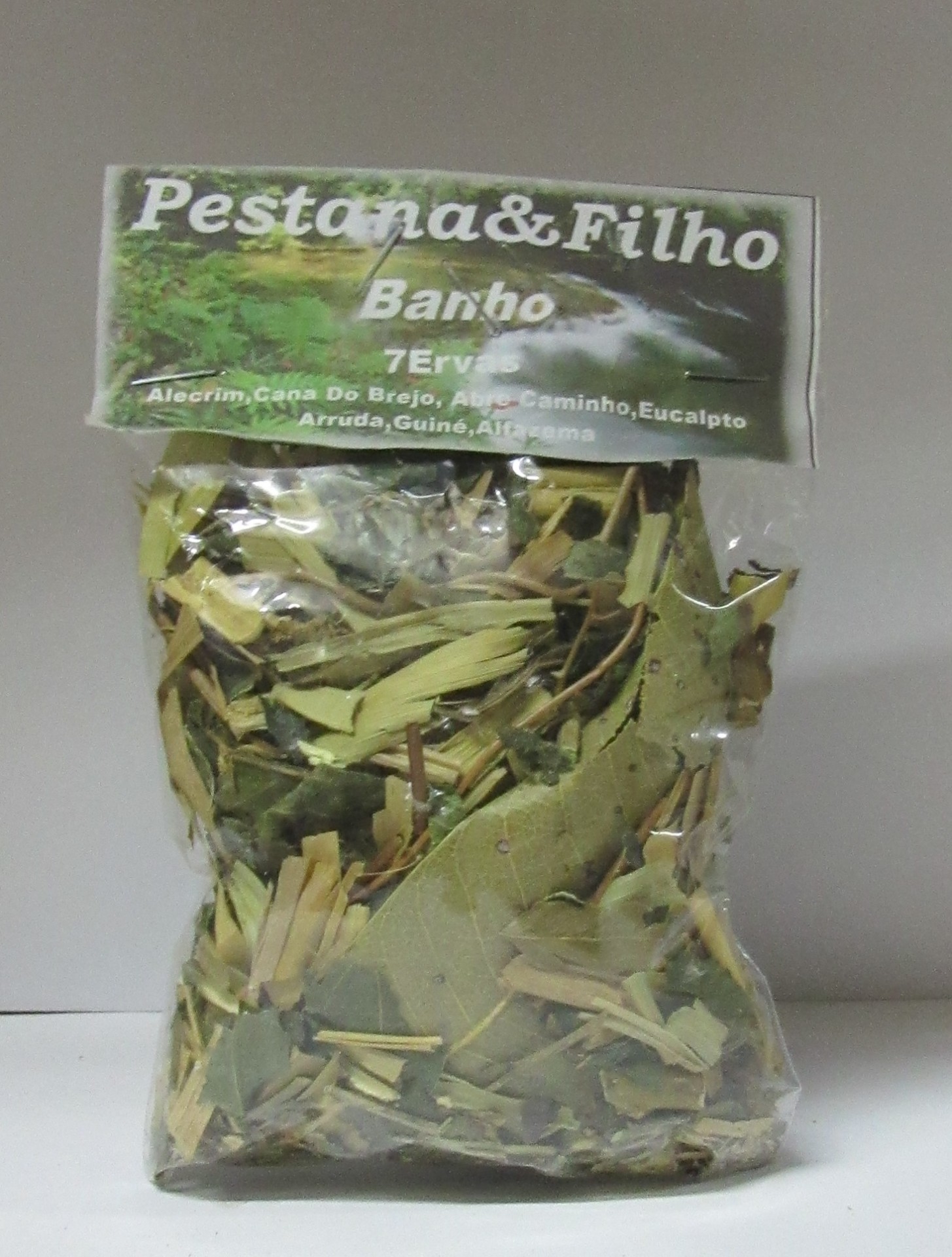 Pacote de ervas secas para banho com etiqueta verde 'Pestana & Filho Banho 7 Ervas'