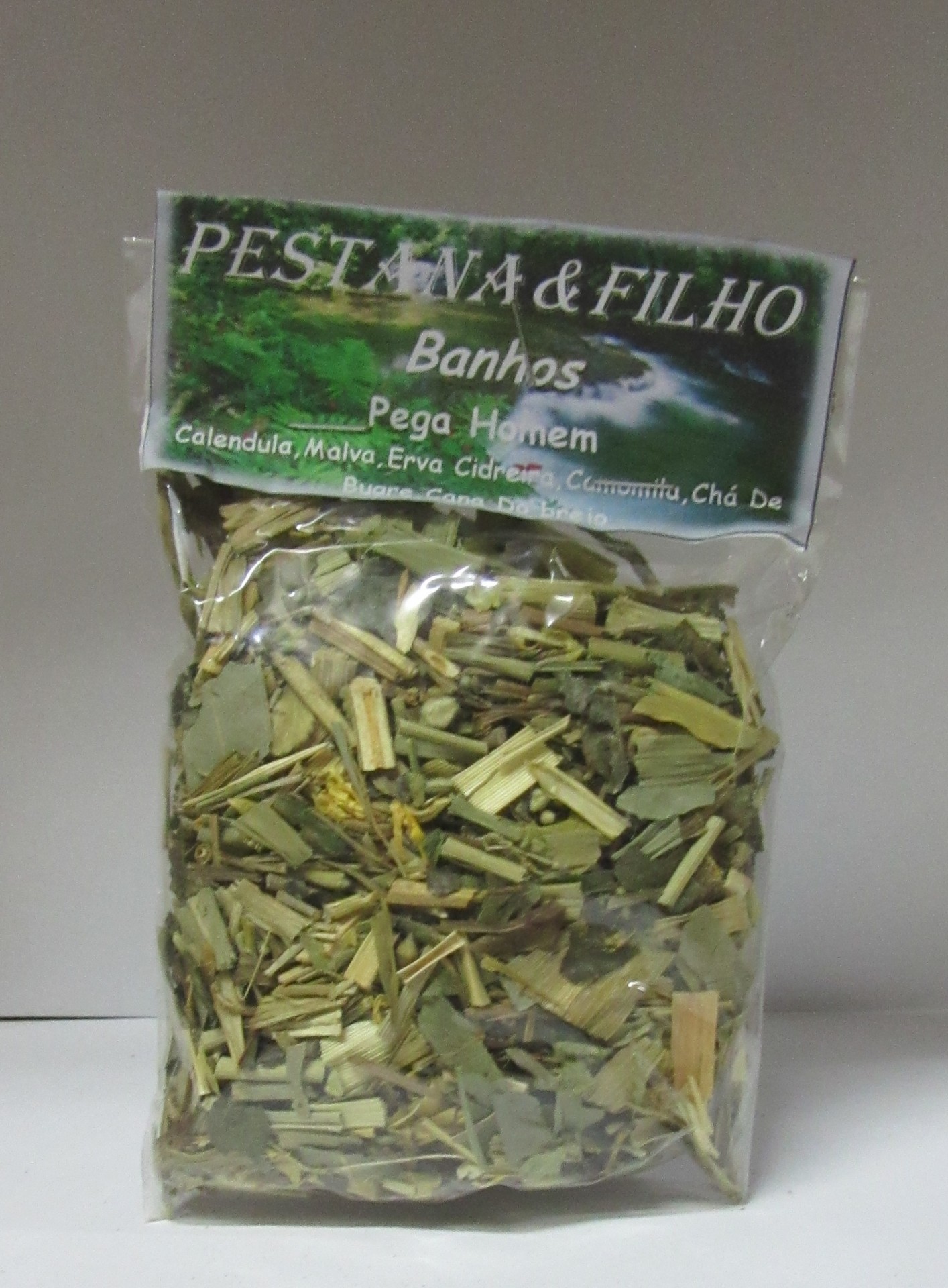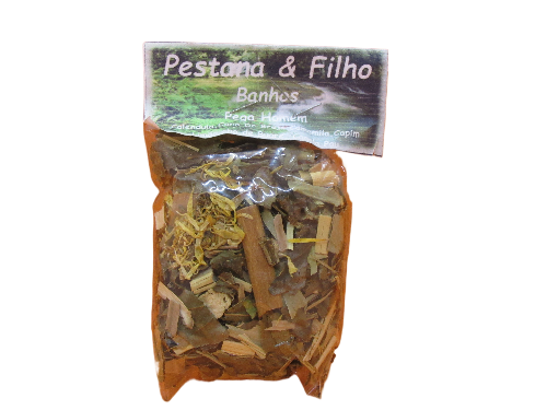 Pacote de mistura de ervas secas para banho com rótulo 'Pestana & Filho Banhos Pega Homem'