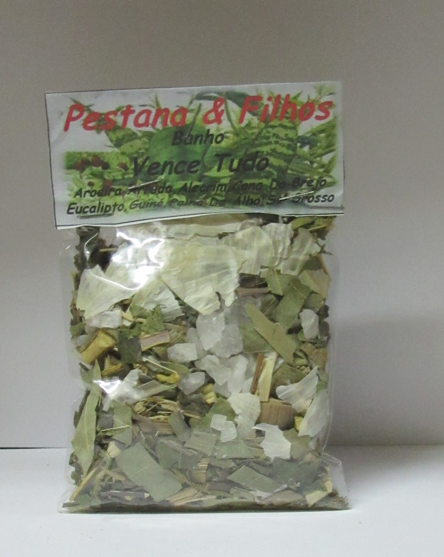 Pacote plástico transparente com ervas secas e etiqueta com texto Pestana & filho Banhos Vencedor