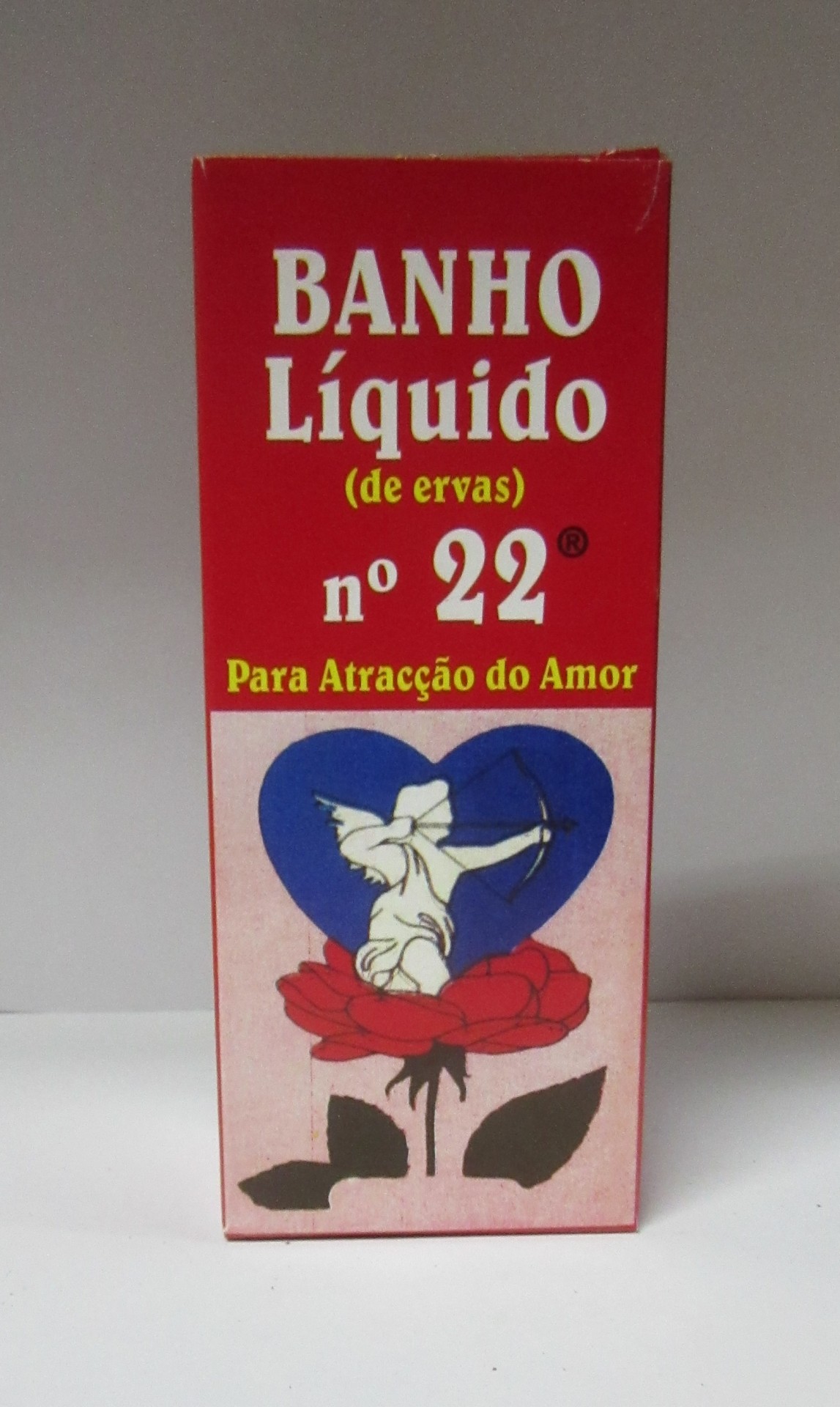 Frasco e caixa de Banho Líquido número 22 para atração do amor com design vermelho e branco e imagem de anjo e rosa.