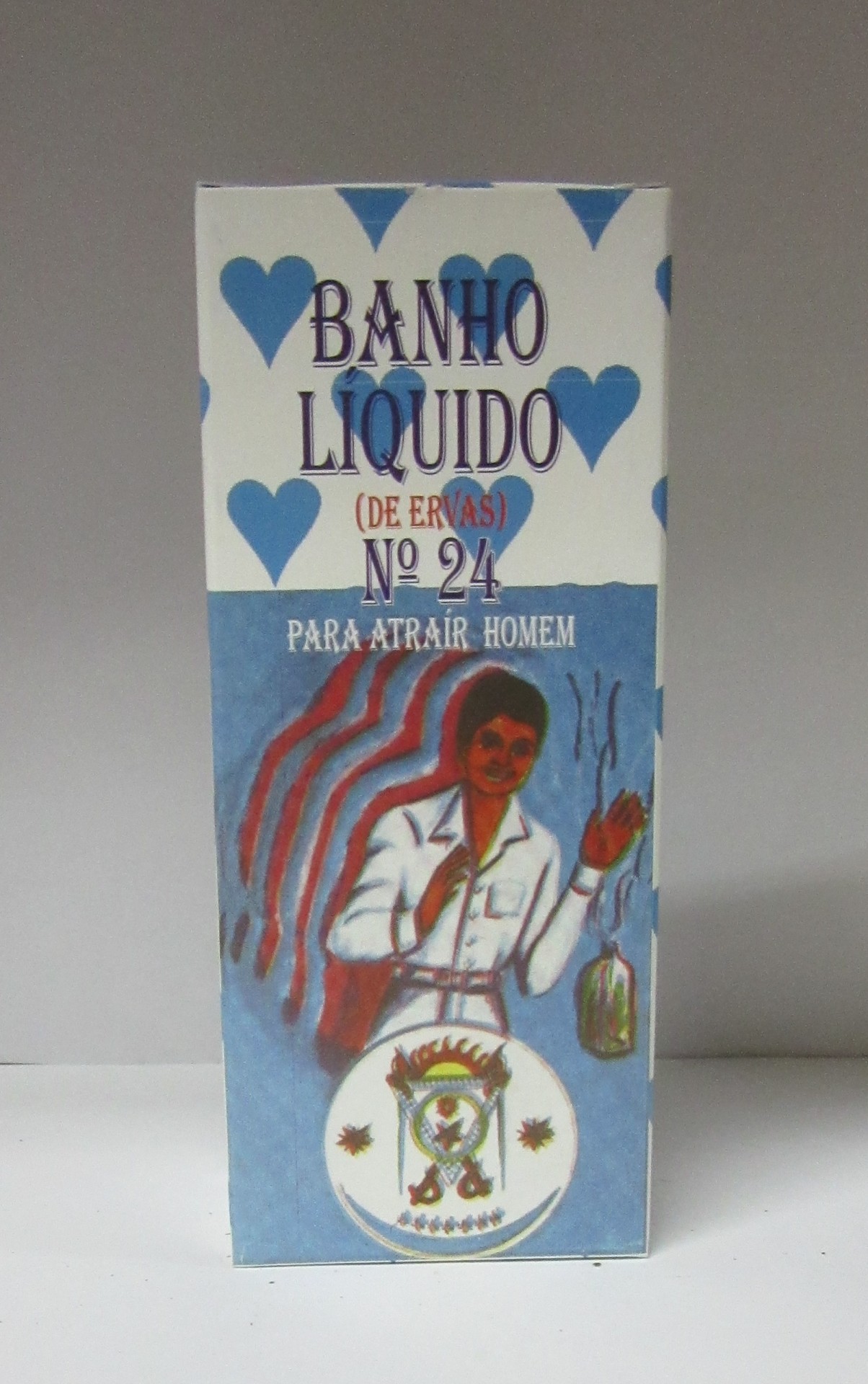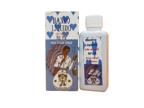 Frasco branco com banho líquido para atrair homem e embalagem com ilustração e texto em português.