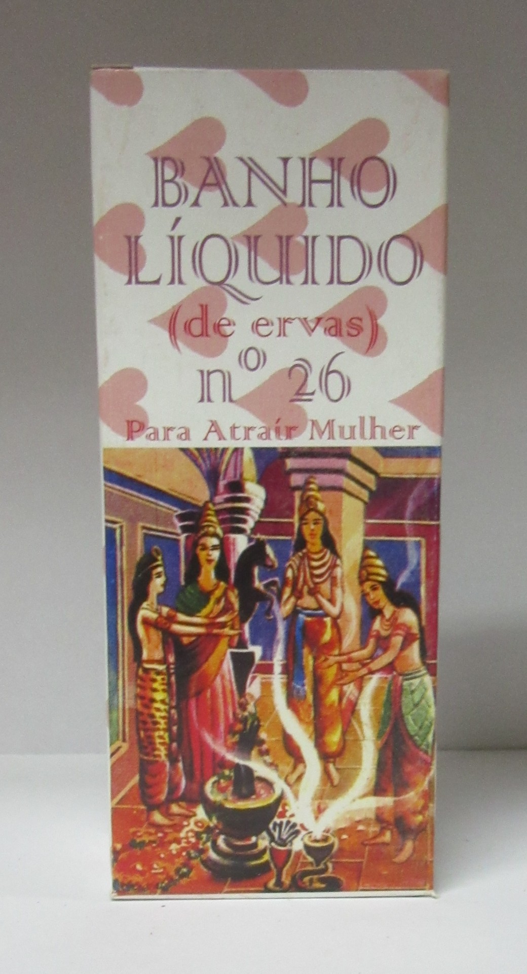 Caixa de banho líquido de ervas com ilustração de mulheres e texto explicativo.