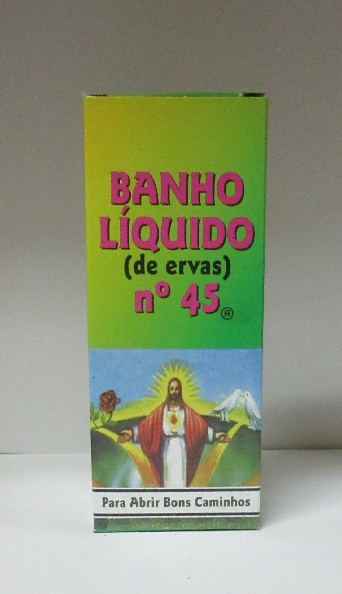 Frasco branco e caixa colorida de Banho Líquido (de ervas) nº 45 com imagem religiosa