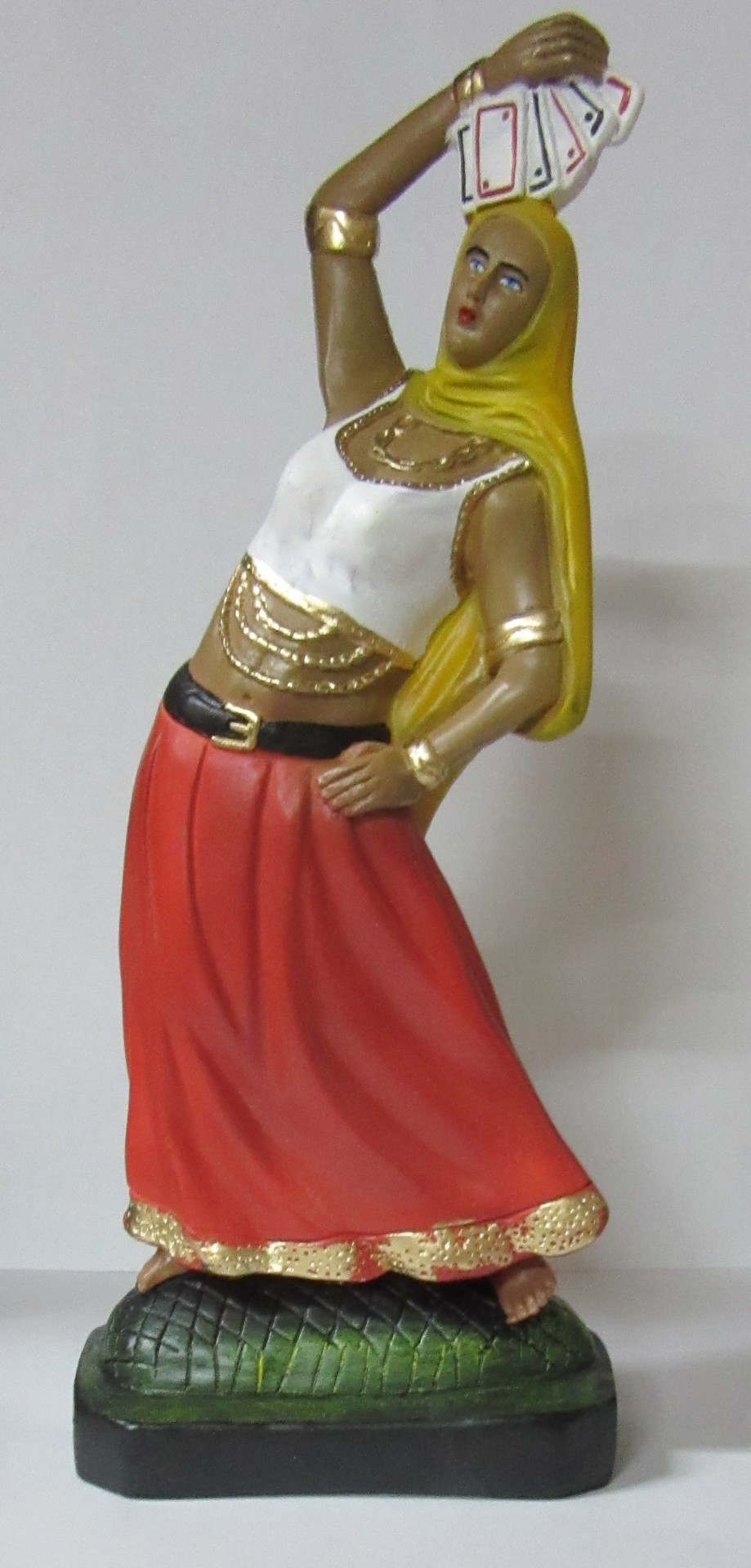 Estátua decorativa de mulher com lenço amarelo e saia vermelha segurando cartas