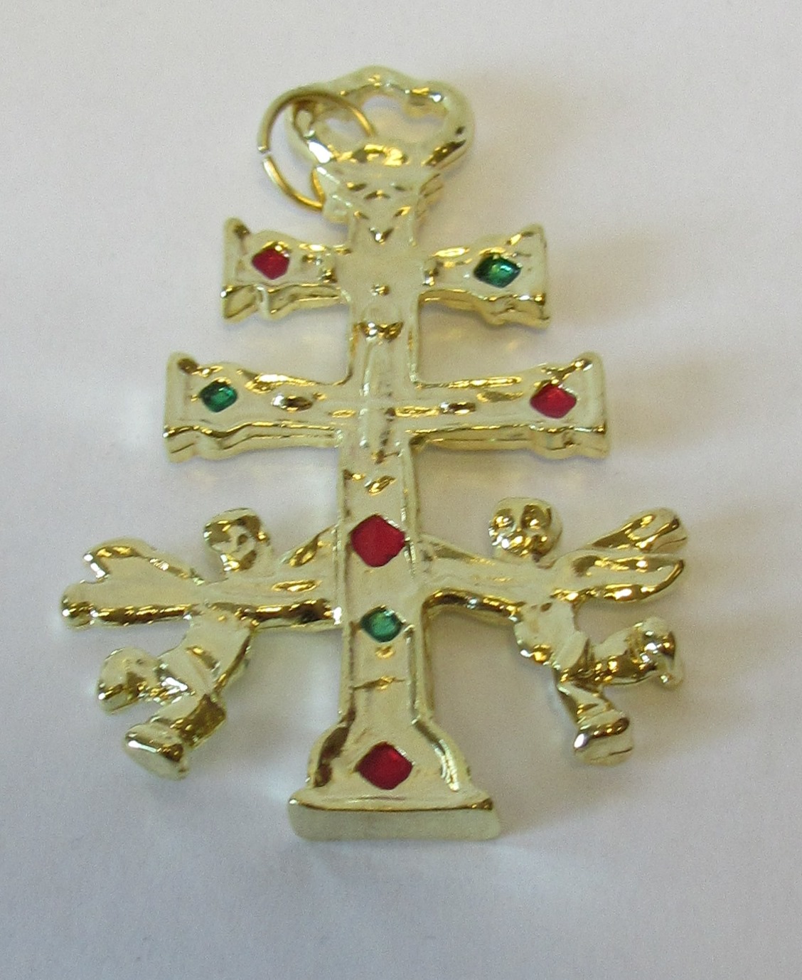 Pingente dourado cruz com pedras vermelhas e verdes sobre fundo branco