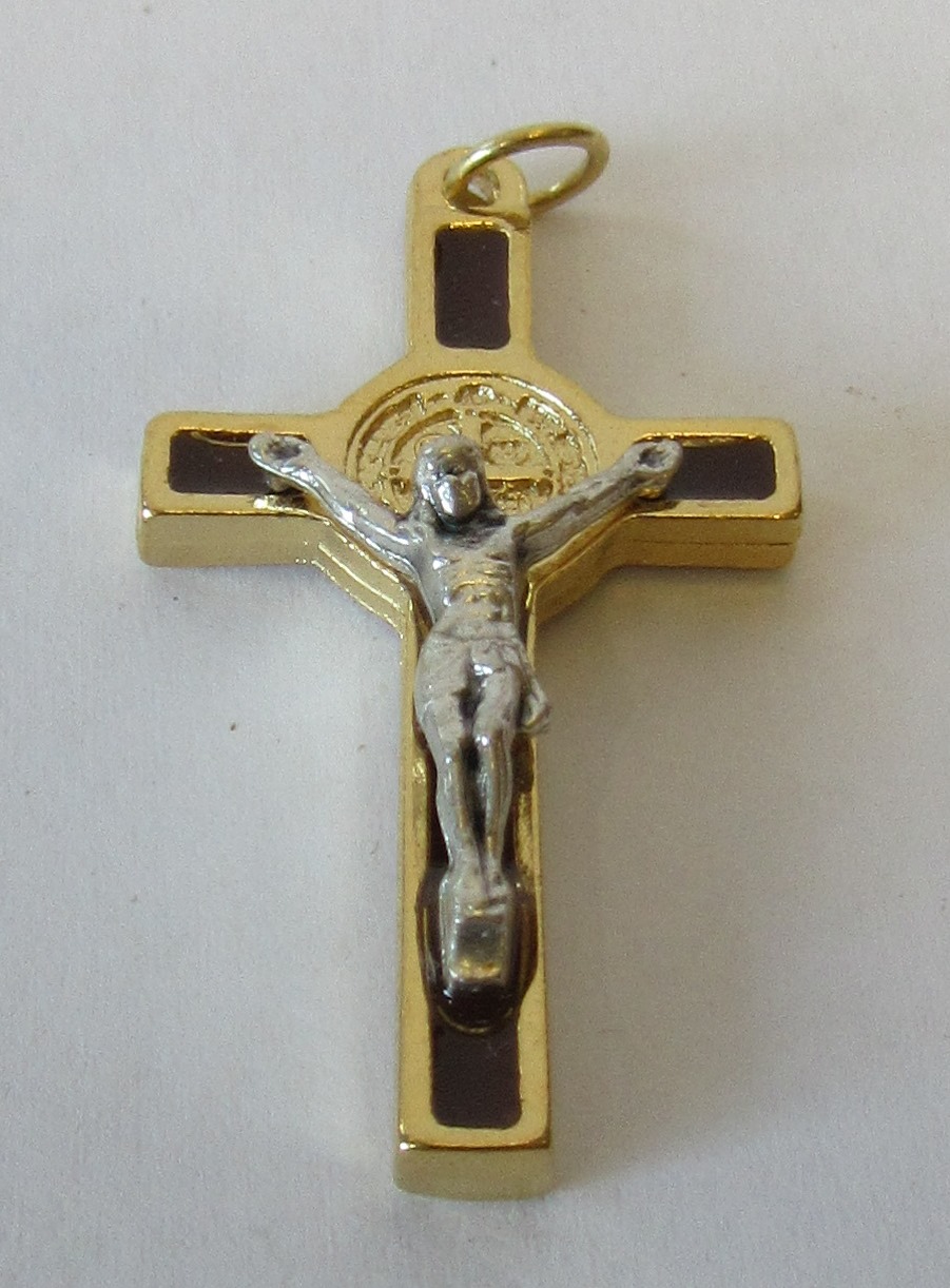 Pendente de cruz dourada com figura de Cristo prateada e detalhes castanhos