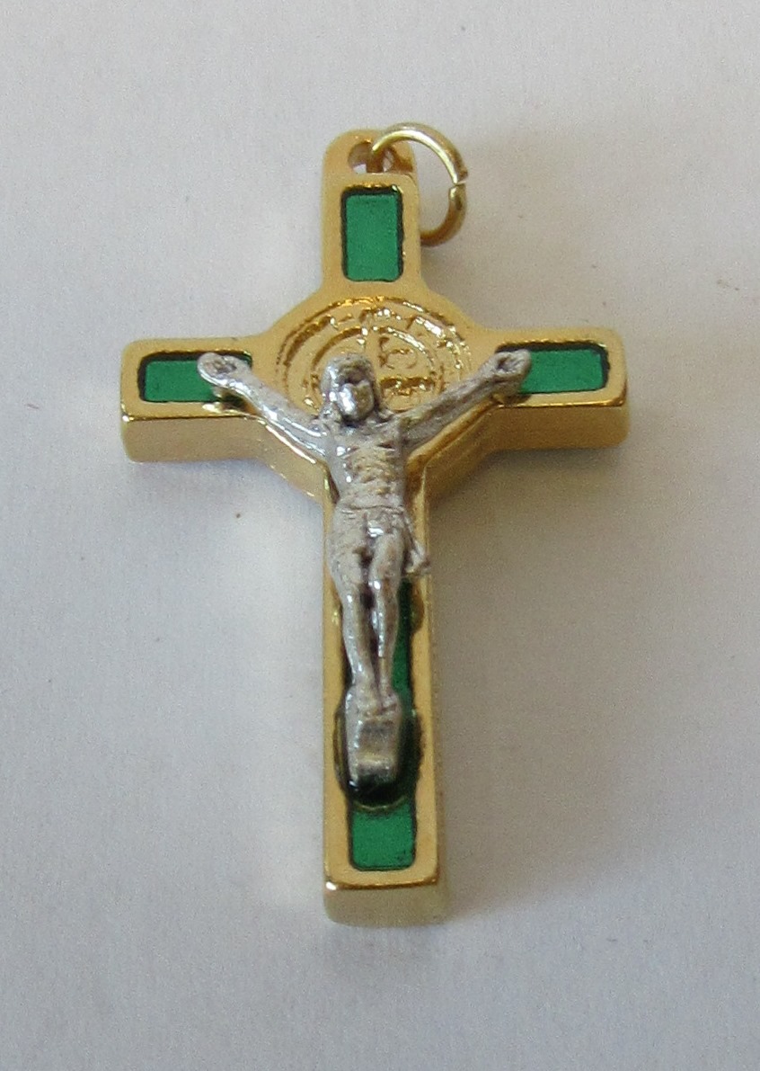 Pendente cruz dourada com detalhes verdes e figura de Cristo prateada