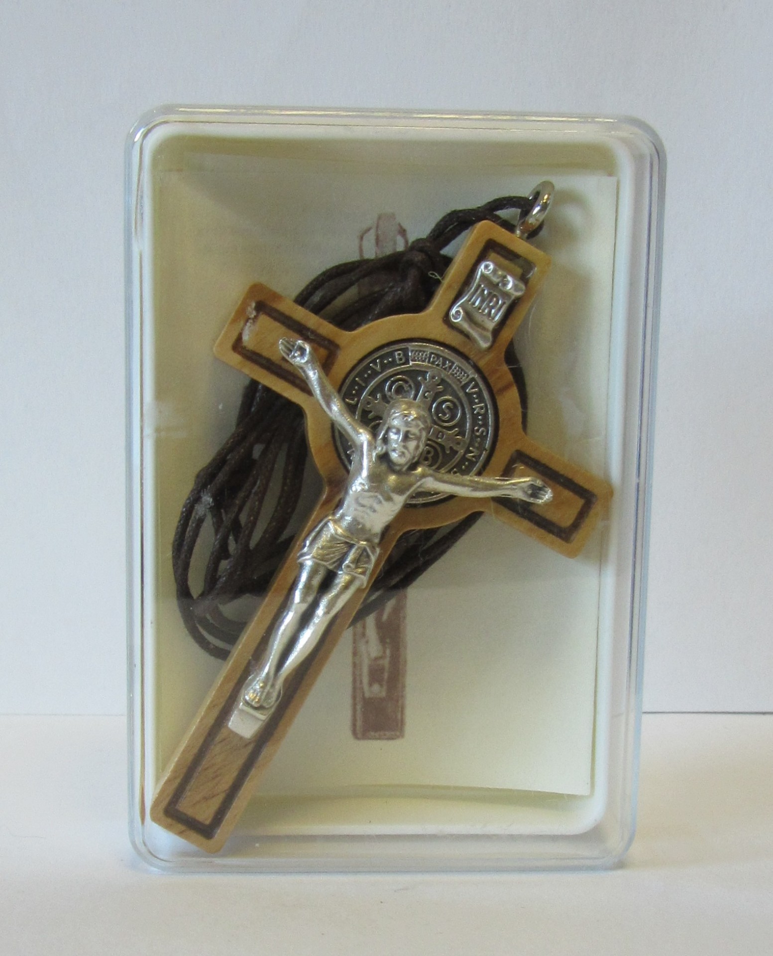 Crucifixo de madeira e metal com cordão em embalagem plástica