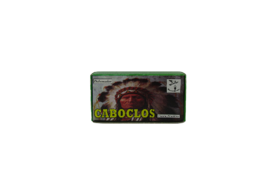Embalagem verde com imagem indígena e texto CABOCLOS