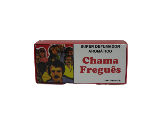 Embalagem retangular de produto aromático Chama Freguês com texto e ilustração de pessoas