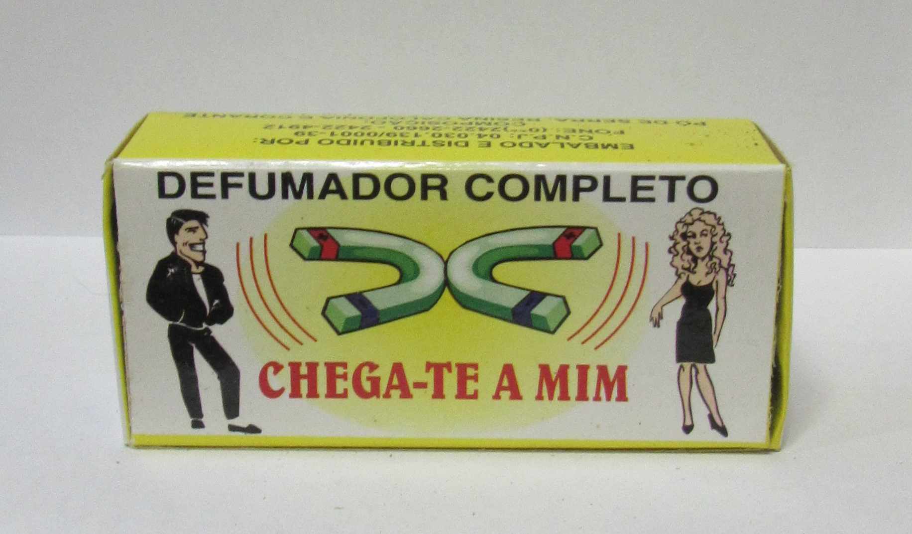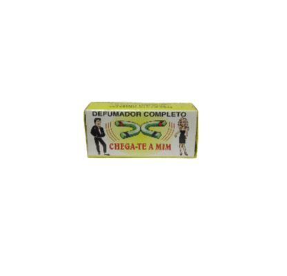 Caixa do Defumador Completo amarela e branca com texto e imagens de incenso