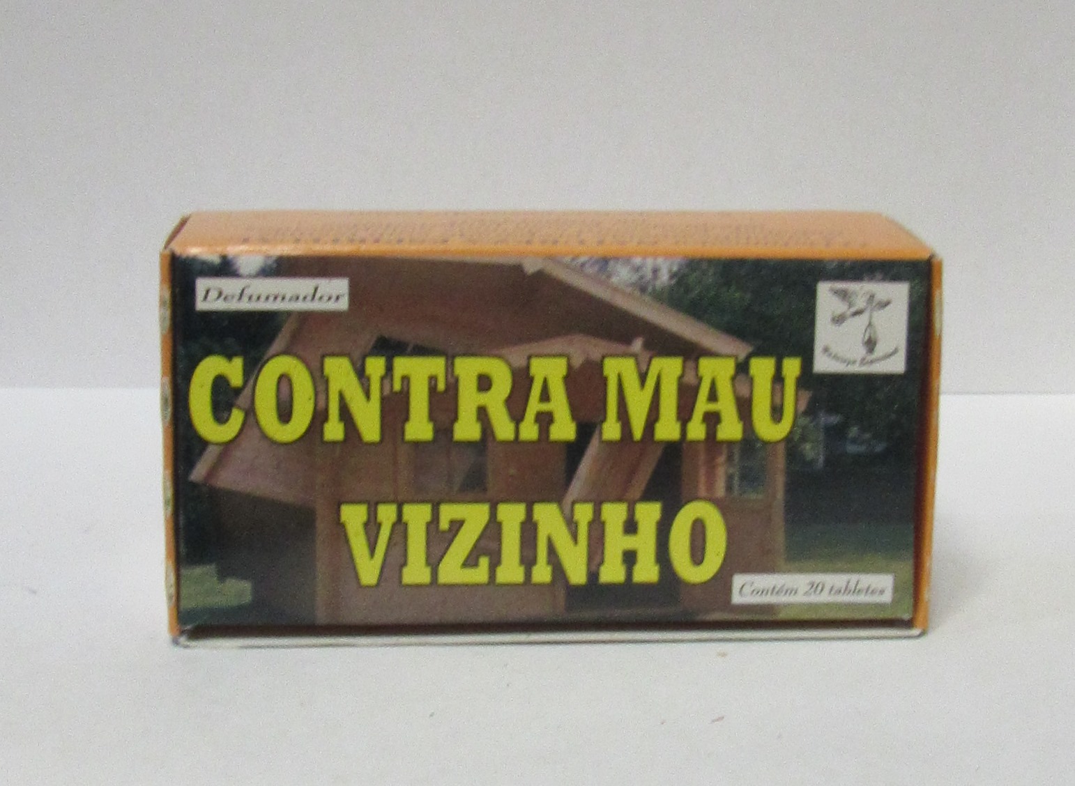 Caixa de papel para produtos com texto CONTRA MAU VIZINHO em amarelo