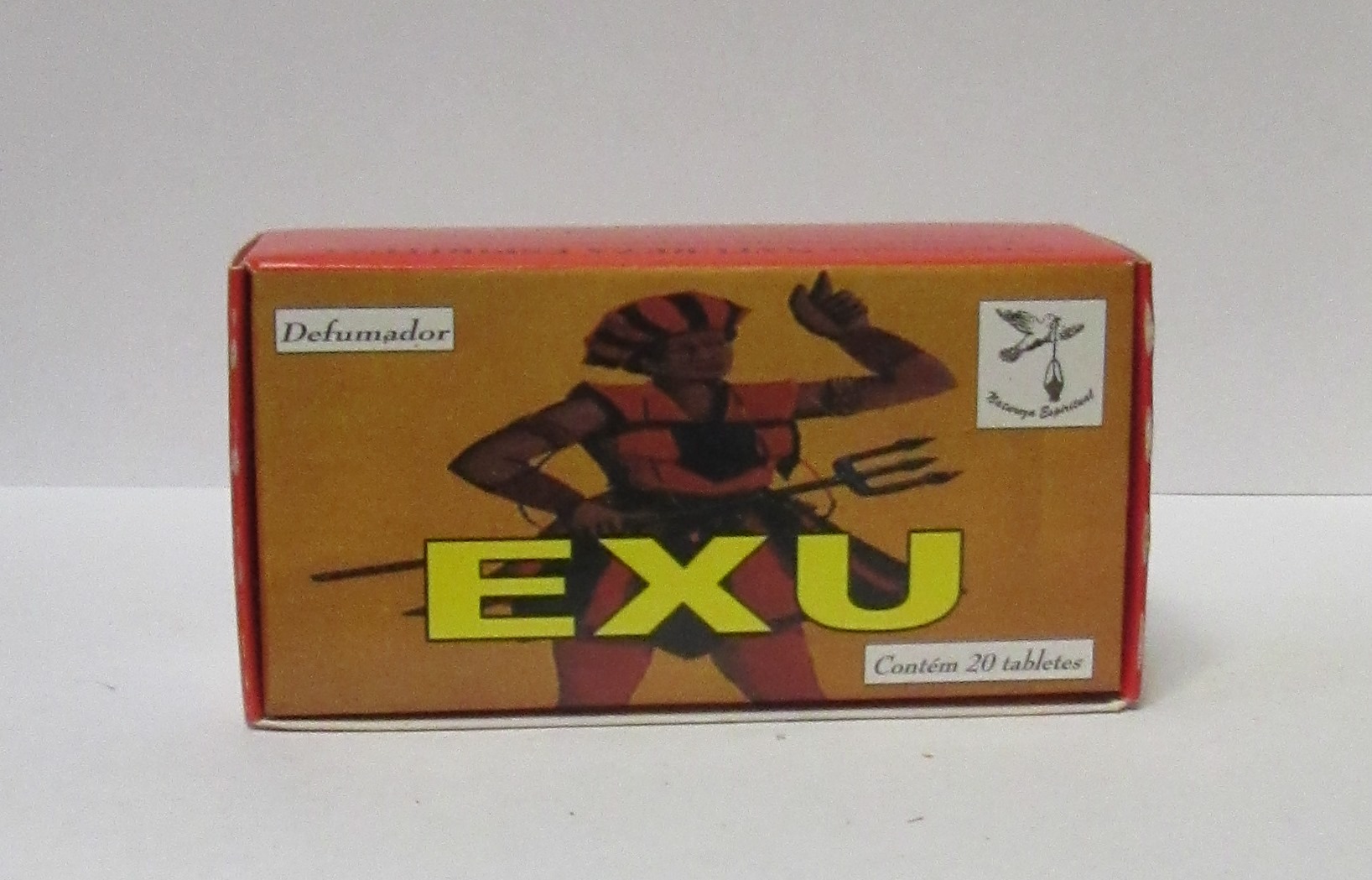 Embalagem castanha com texto EXU em amarelo e figura humana