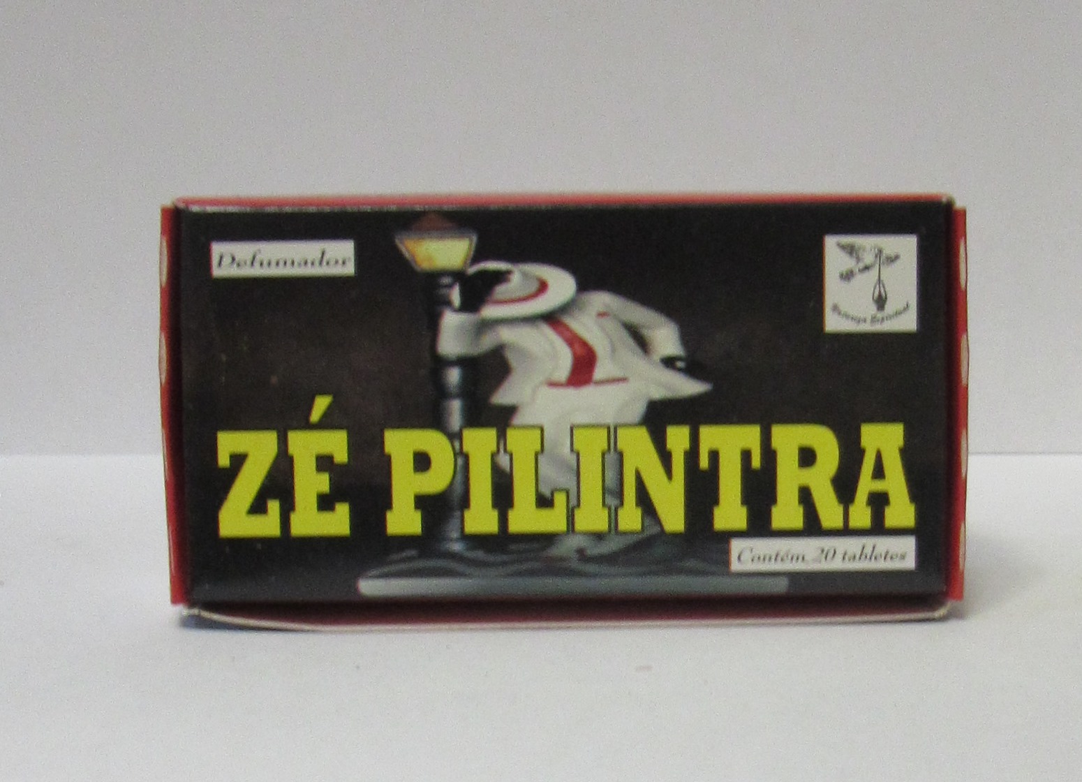 Embalagem de comprimidos ZÉ PILINTRA com ilustração e texto em fundo preto