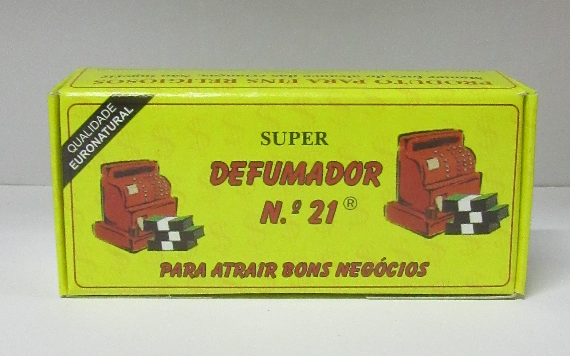 Embalagem amarela de defumador N.º 21 com texto e imagens vermelhas e pretas