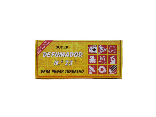 Embalagem amarela do produto Super Defumador N.º 23 com texto e ícones em vermelho e branco