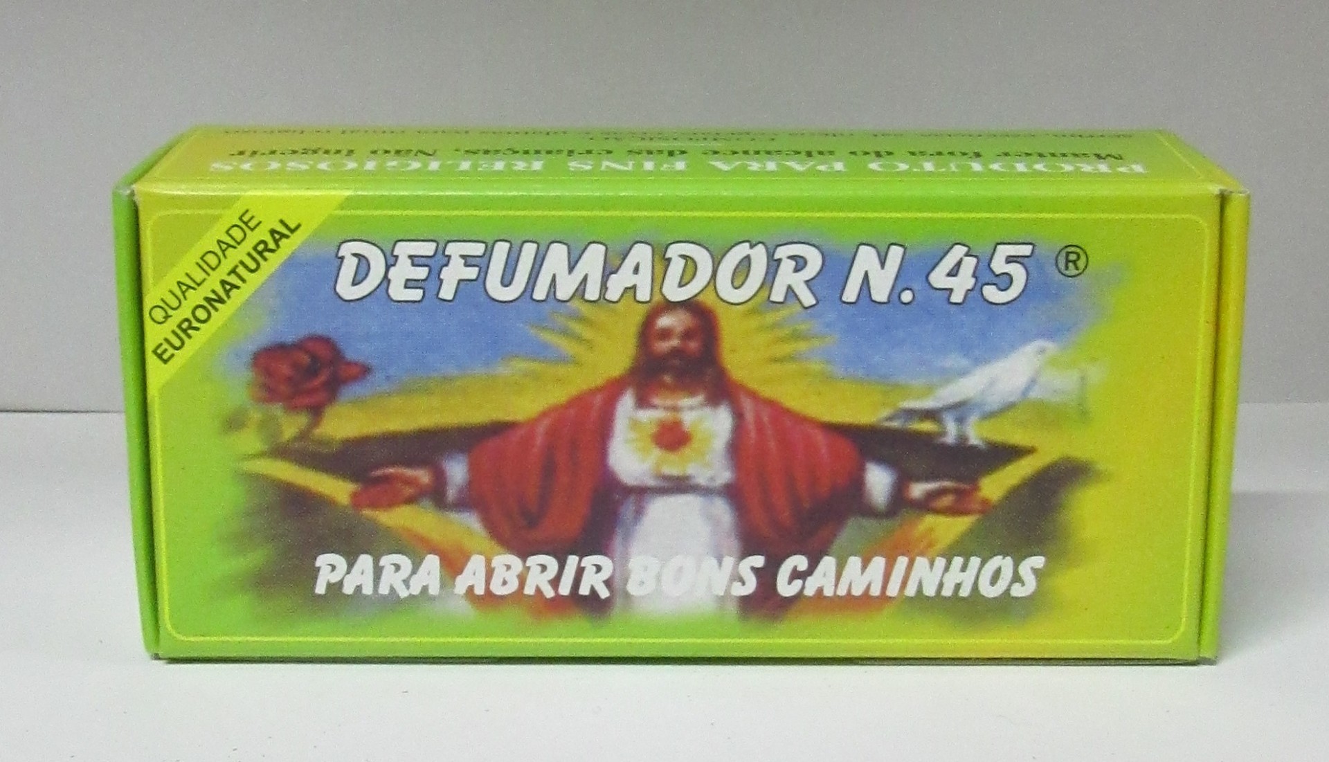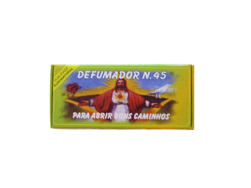 Embalagem amarela de defumador com figura religiosa e texto promocional