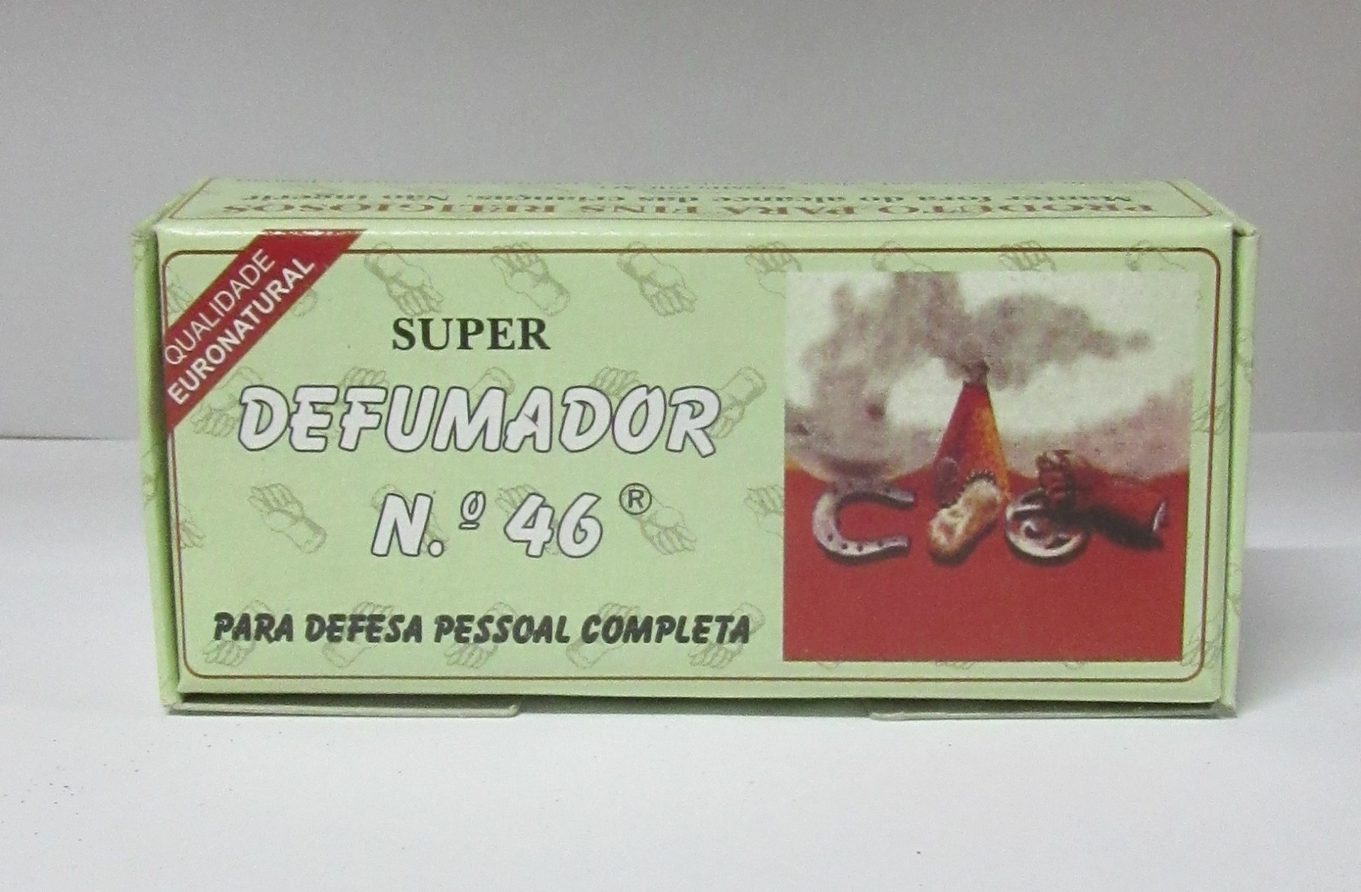 Embalagem de Super Defumador N.º 46 para defesa pessoal com ilustração e texto.