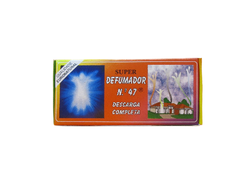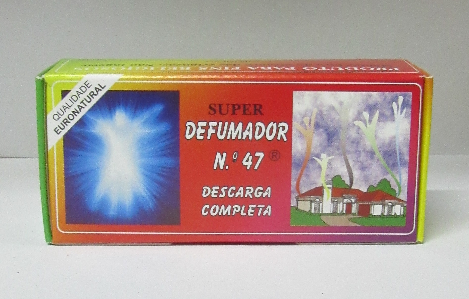Embalagem colorida do produto Super Defumador N.º 47 com imagens de luz e chaminé