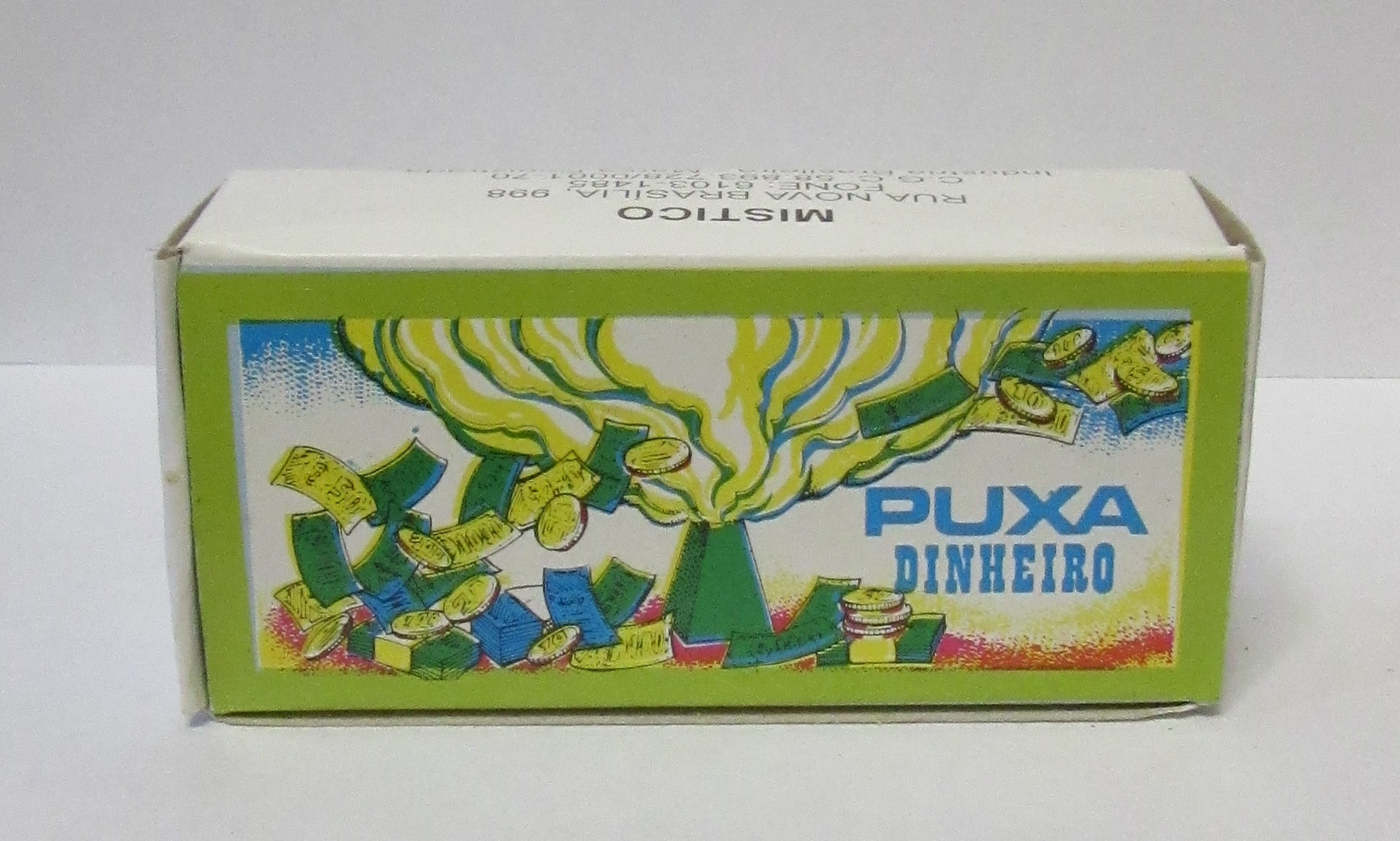Caixa branca com rótulo colorido e texto 'PUXA DINHEIRO'.