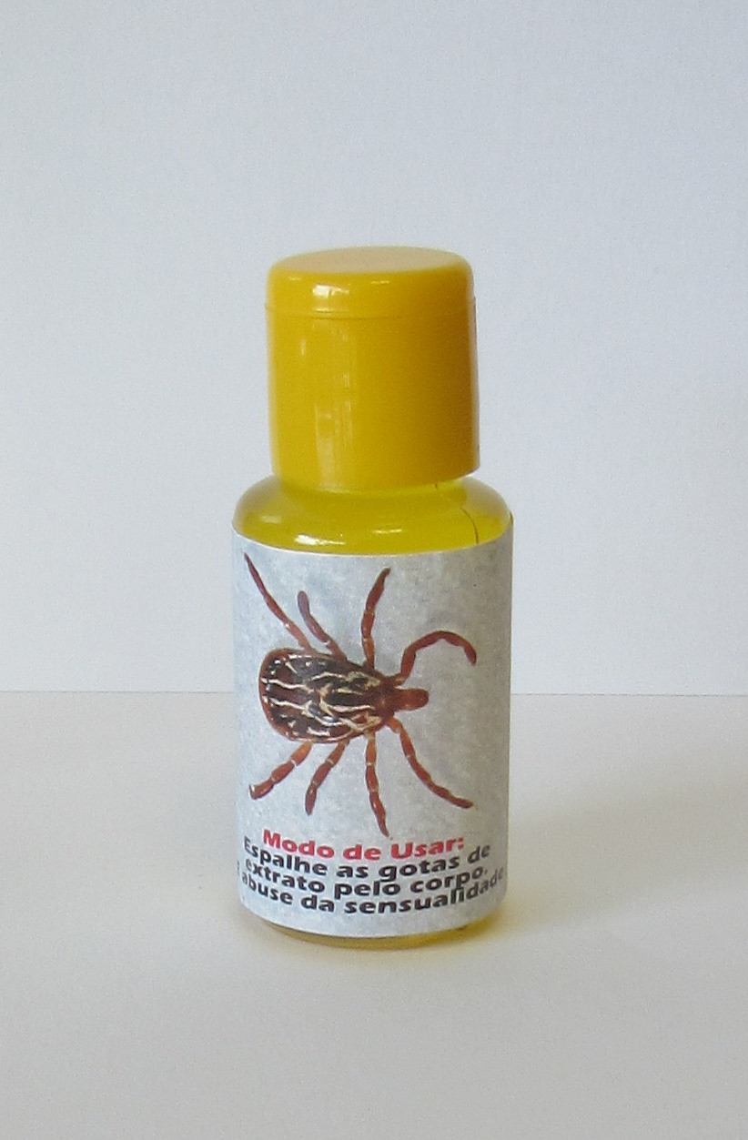Frasco com líquido amarelo e etiqueta com imagem de carraça e texto em português