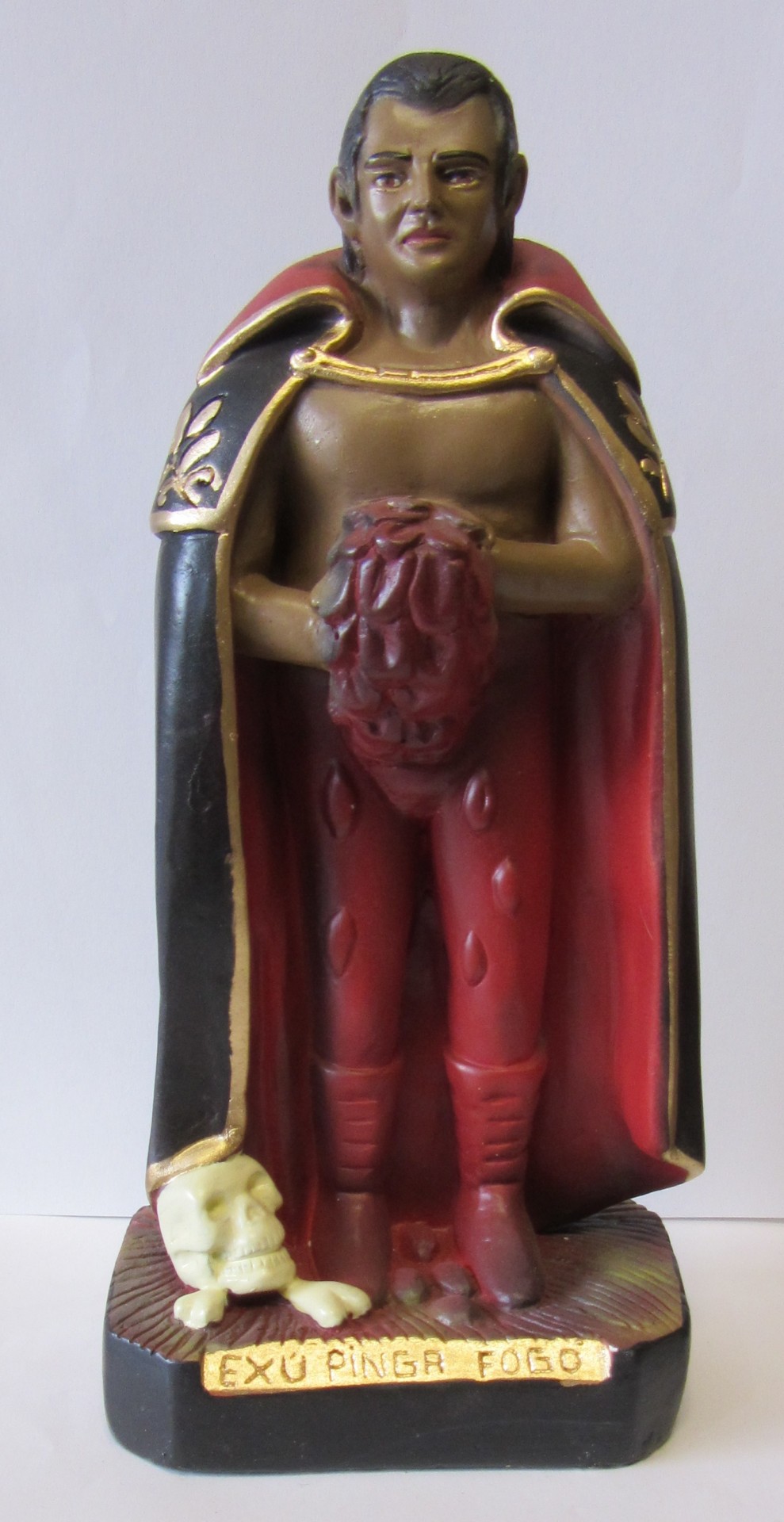 Estatueta de Exu Pinga Fogo com capa preta e interior vermelho
