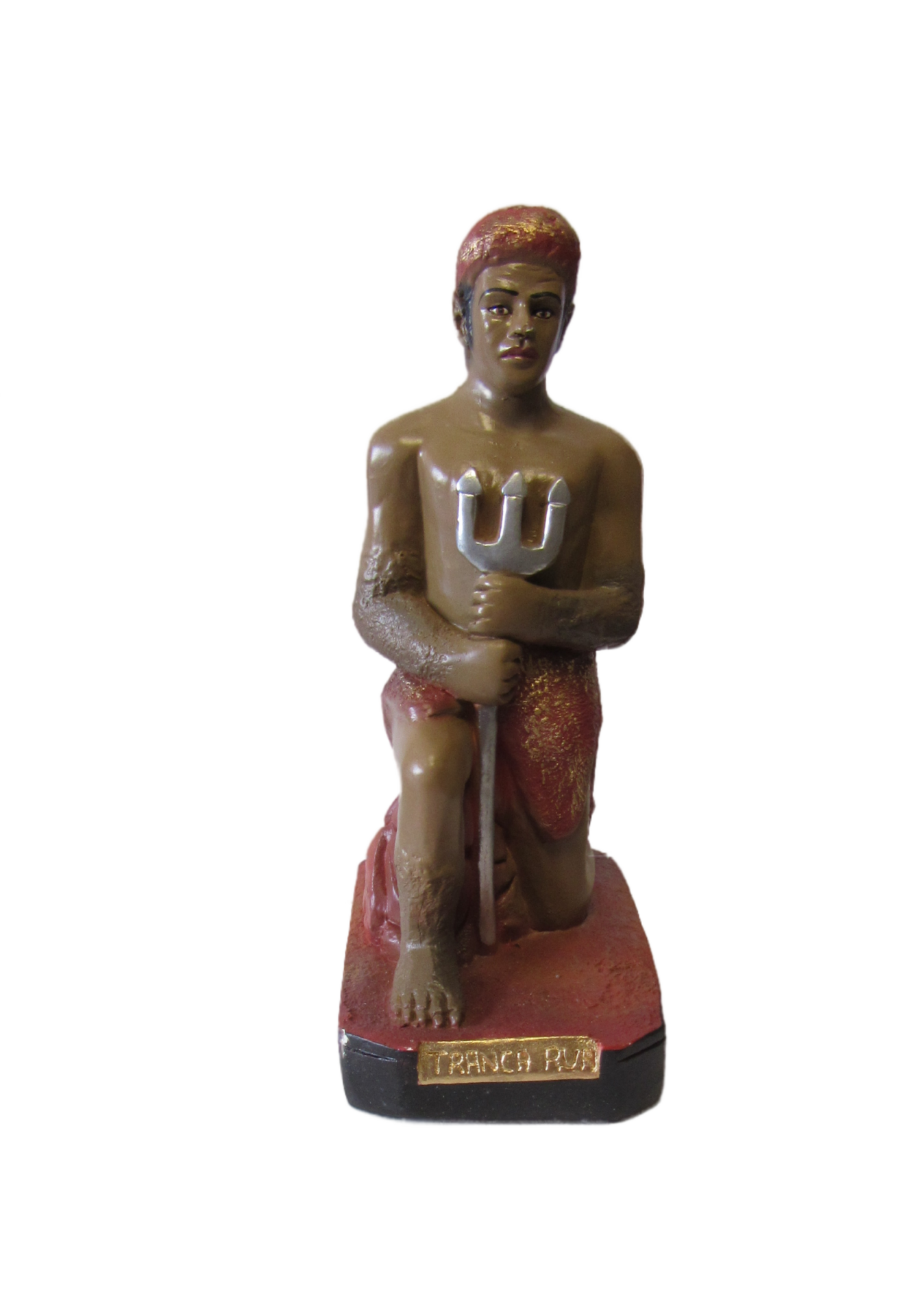 Estátua ajoelhada de figura masculina com tridente e base com rótulo