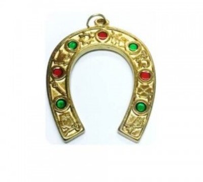 Pendente em ferradura dourada com pedras vermelhas e verdes