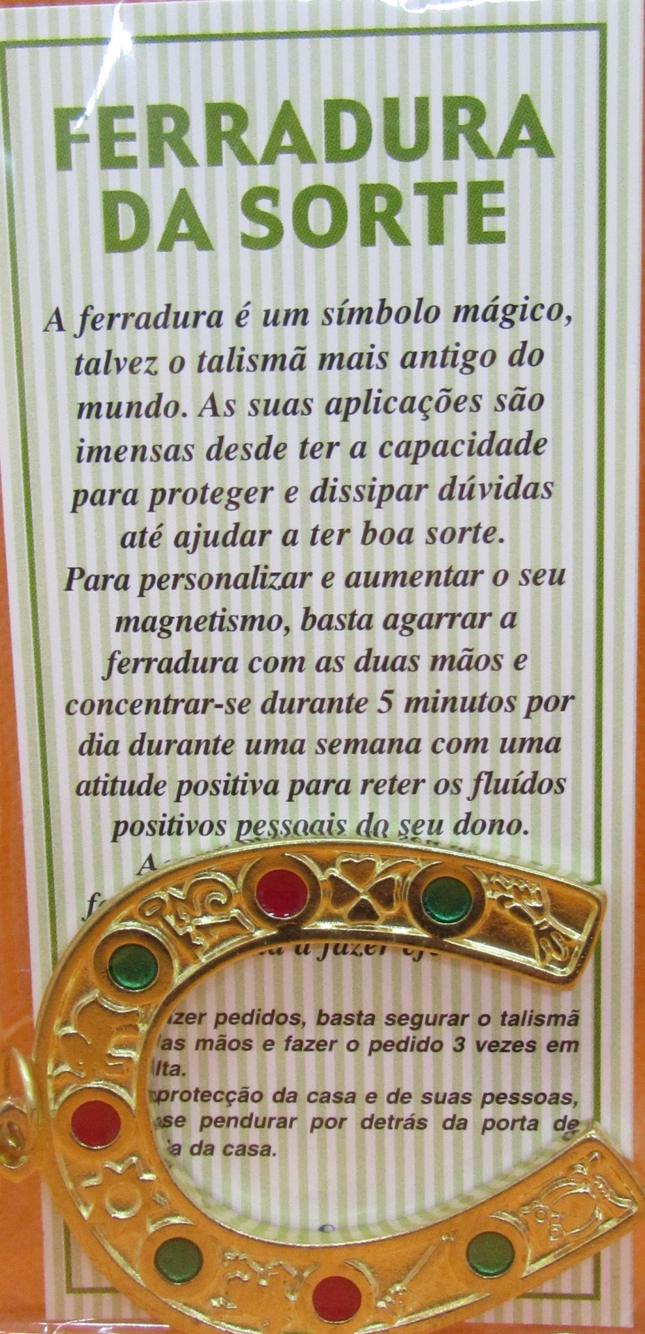 Ferradura da sorte dourada com pedras coloridas e texto explicativo em fundo riscado verde e branco.