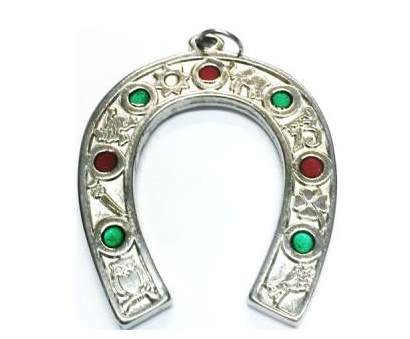 Pingente em forma de ferradura prateada com pedras verdes e vermelhas e detalhes em relevo