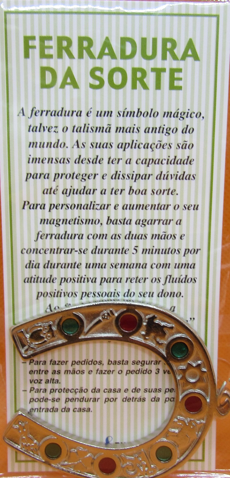Ferradura da sorte metálica com pedras coloridas embutidas num cartão com texto
