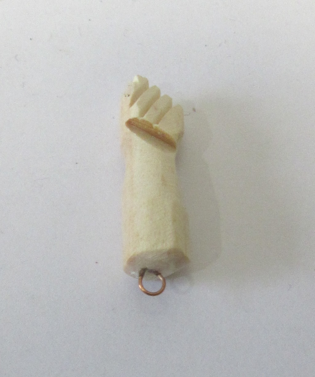 Pingente braço humano em osso com aro dourado sobre fundo branco