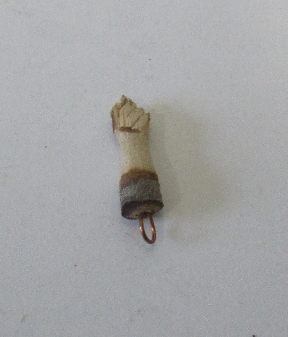 Pingente de madeira em forma de mão fechada com anilha metálica