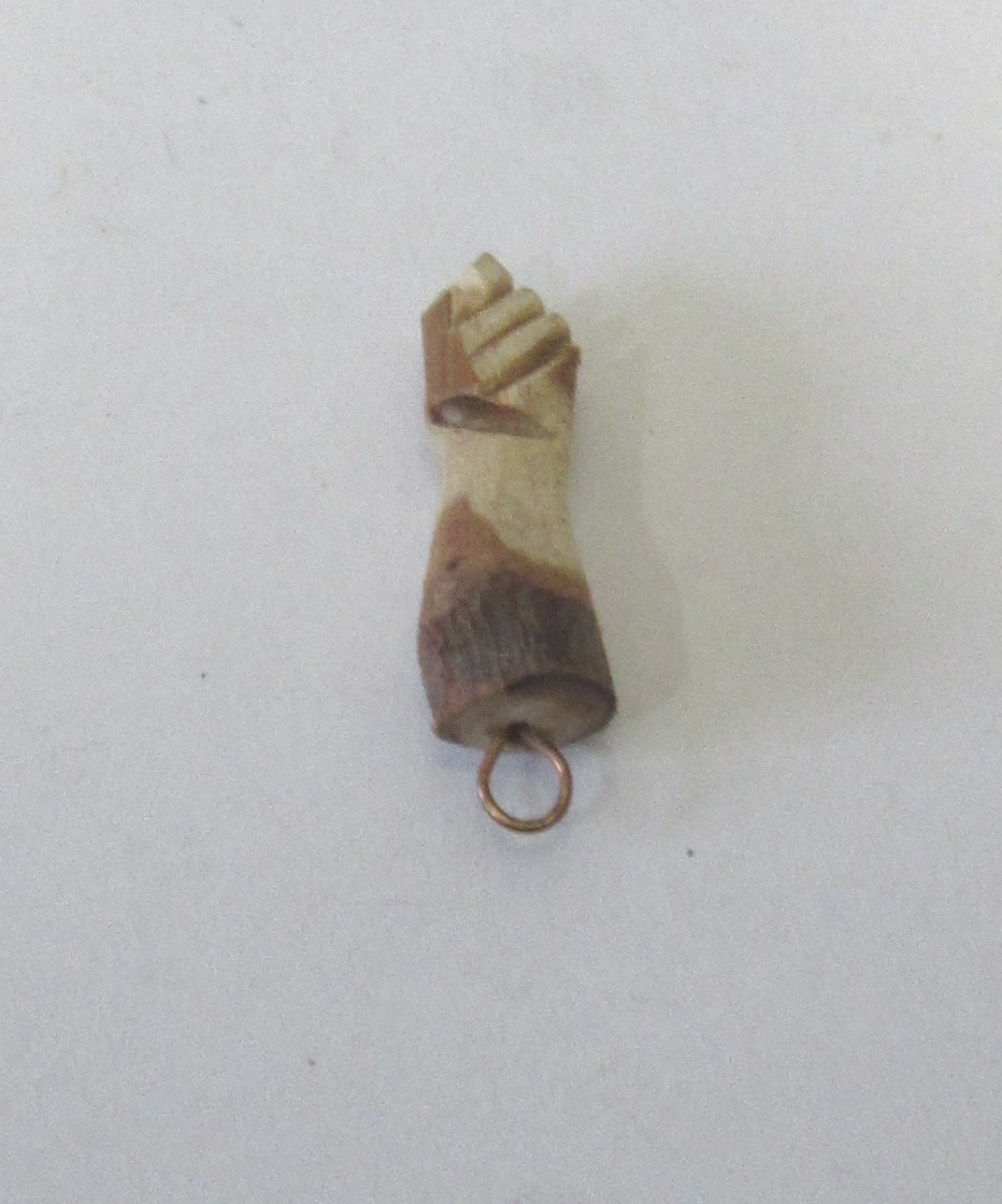 Pingente de madeira em forma de mão fechada com anilha metálica