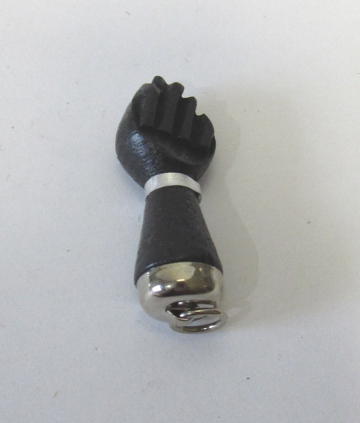 Peça em forma de punho fechado preta com base prateada sobre fundo branco.