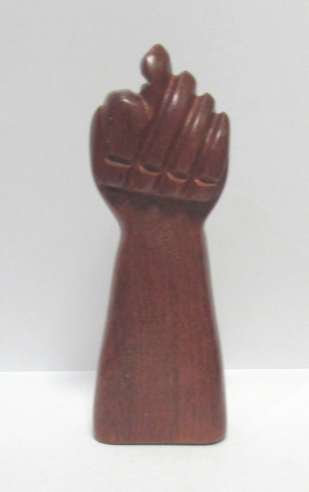 Escultura de madeira em forma de punho fechado com polegar sobre os dedos