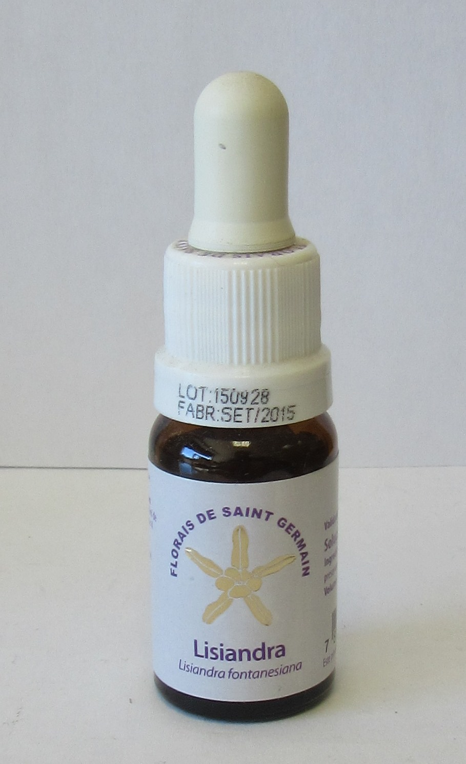 Frasco pequeno de vidro castanho com conta-gotas branco e etiqueta com texto e imagem de flor
