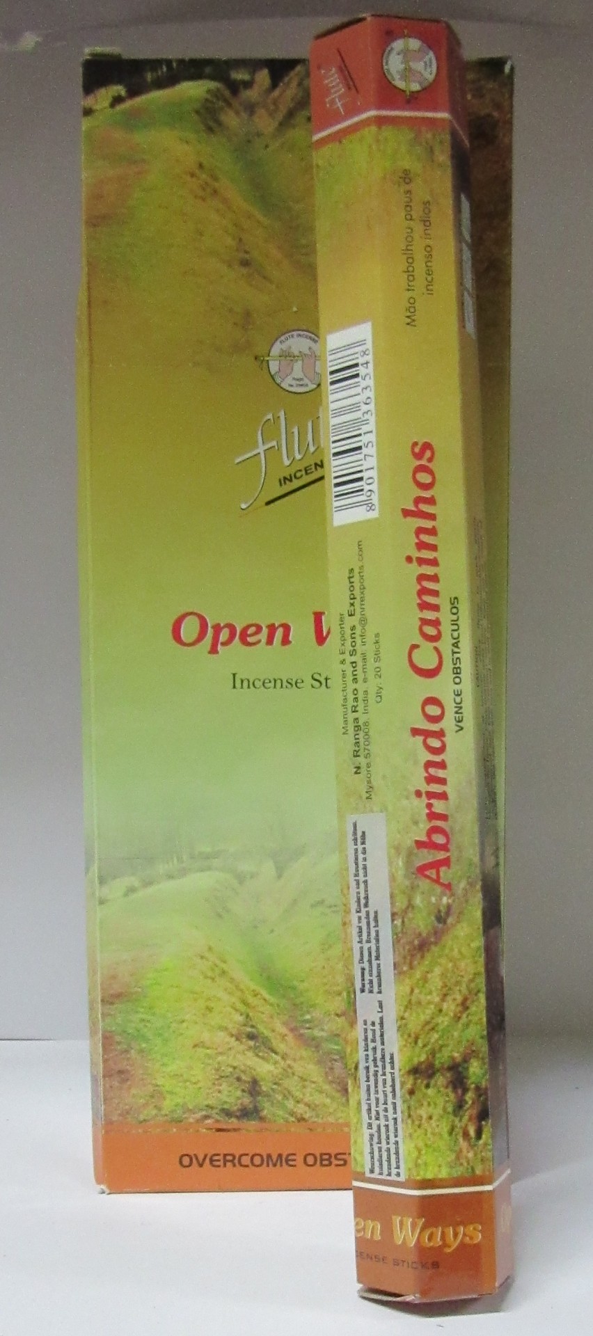 Pacote de incenso 'Abrindo Caminhos' com imagem de colinas verdes e texto em inglês e português