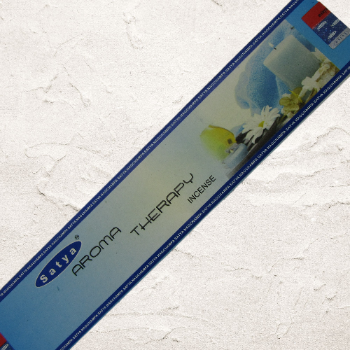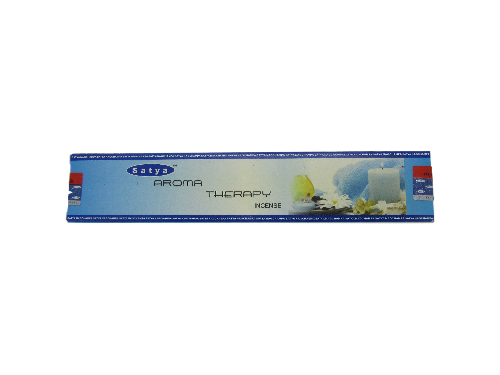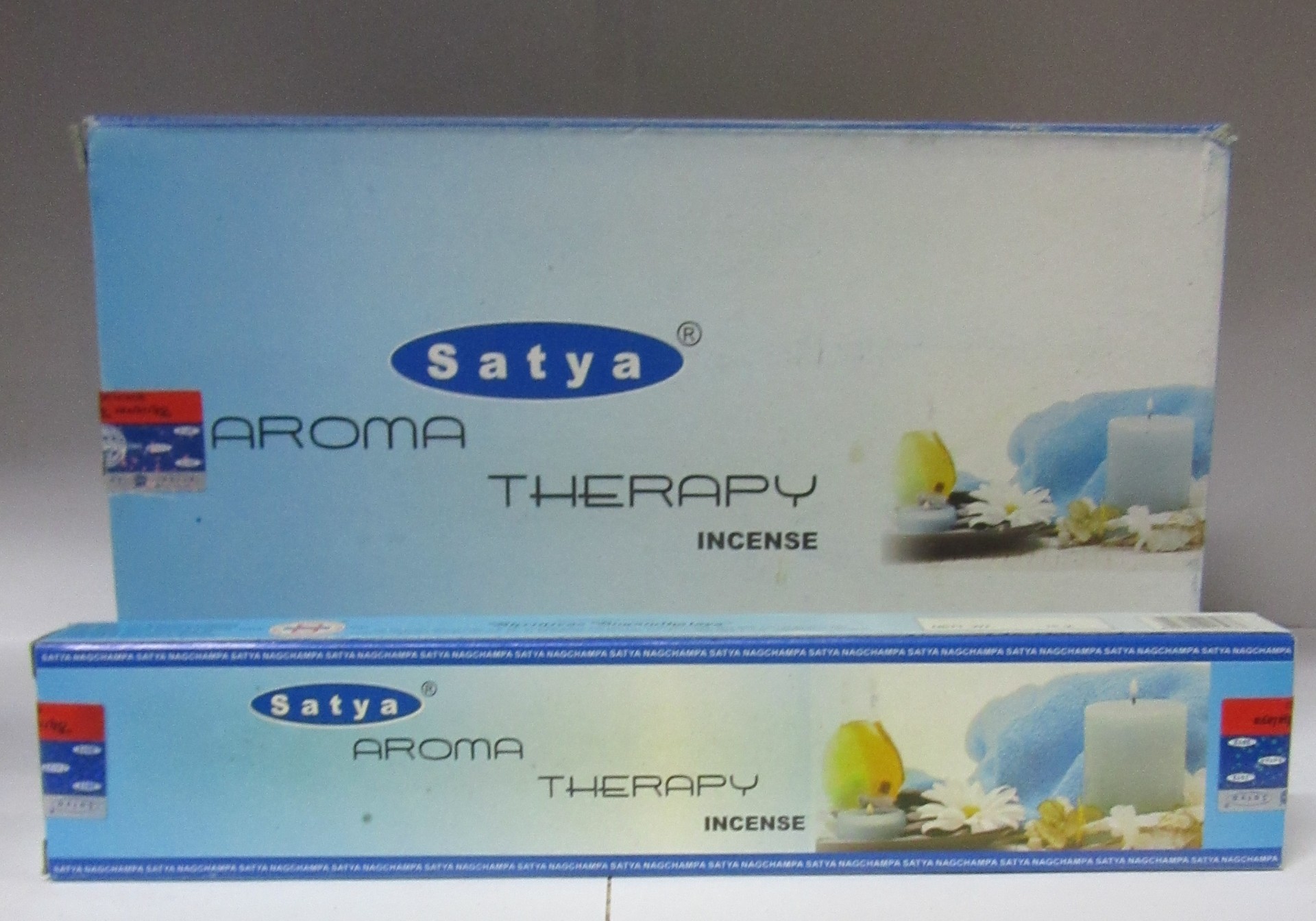 Duas caixas de incenso Satya Aroma Therapy com design azul e branco e elementos visuais de fogo, pedra e flores