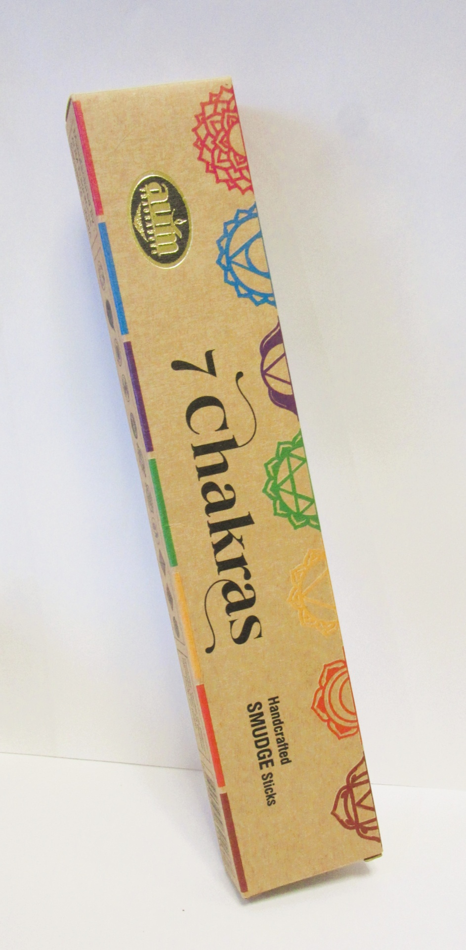 Embalagem de papel kraft com símbolos coloridos dos chakras e texto 7 Chakras Handcrafted SMUDGE Sticks.
