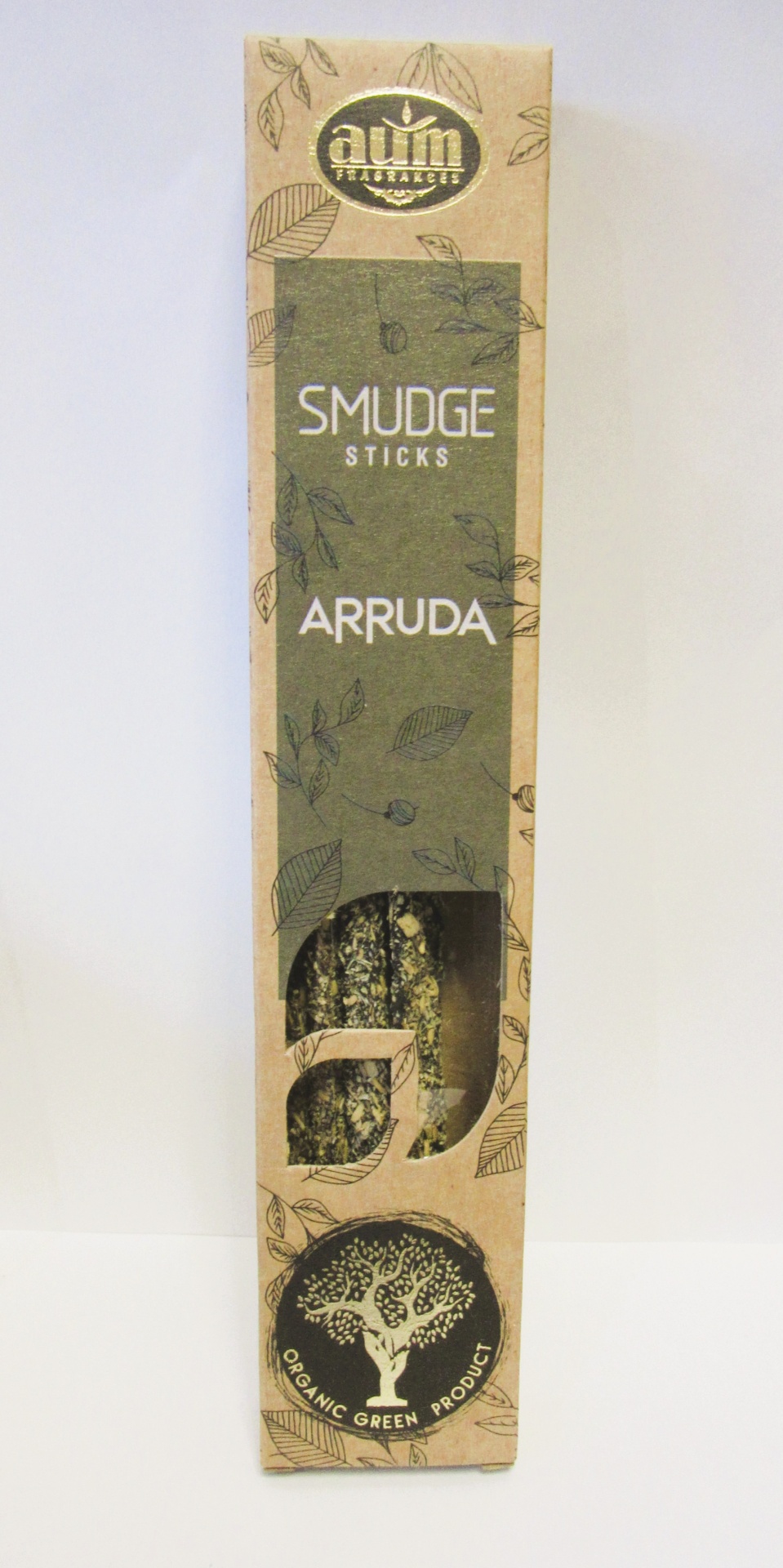 Embalagem de papel castanho com Smudge Sticks Arruda e selo orgânico.