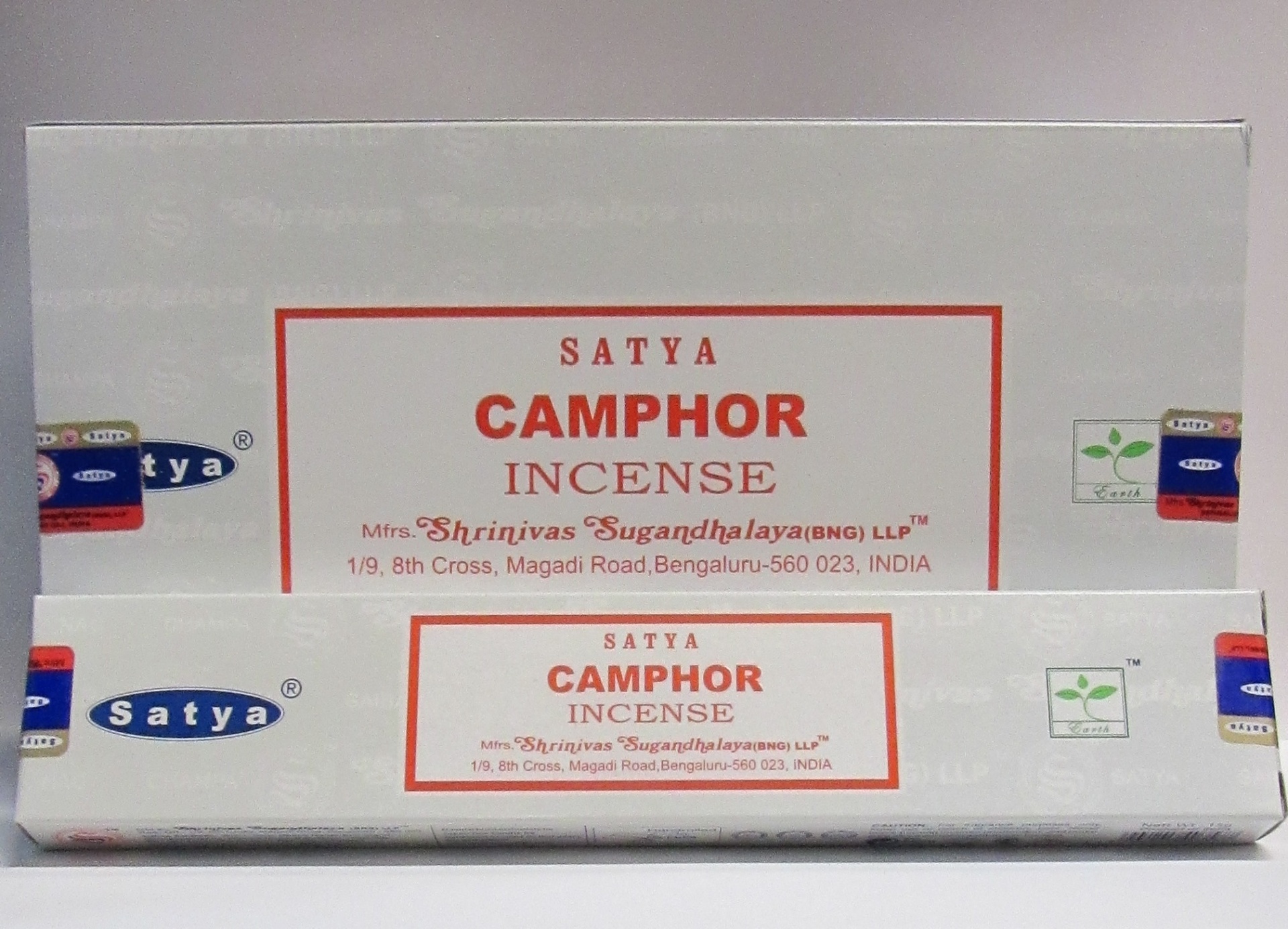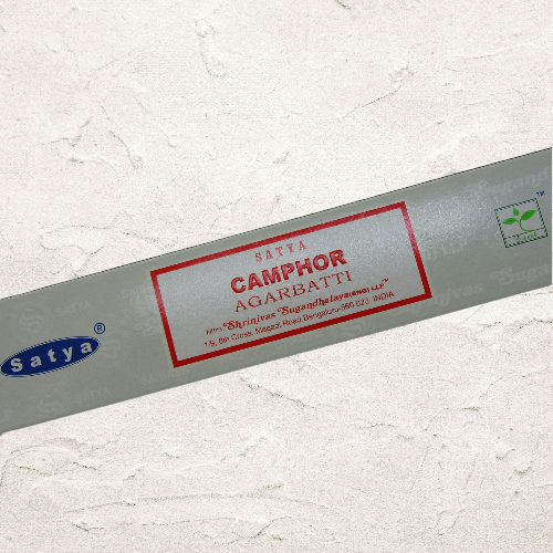 Caixa branca de incenso Satya Camphor com texto vermelho e detalhes azuis