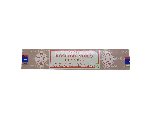 Embalagem de incenso Satya Positive Vibes com texto e selo de qualidade